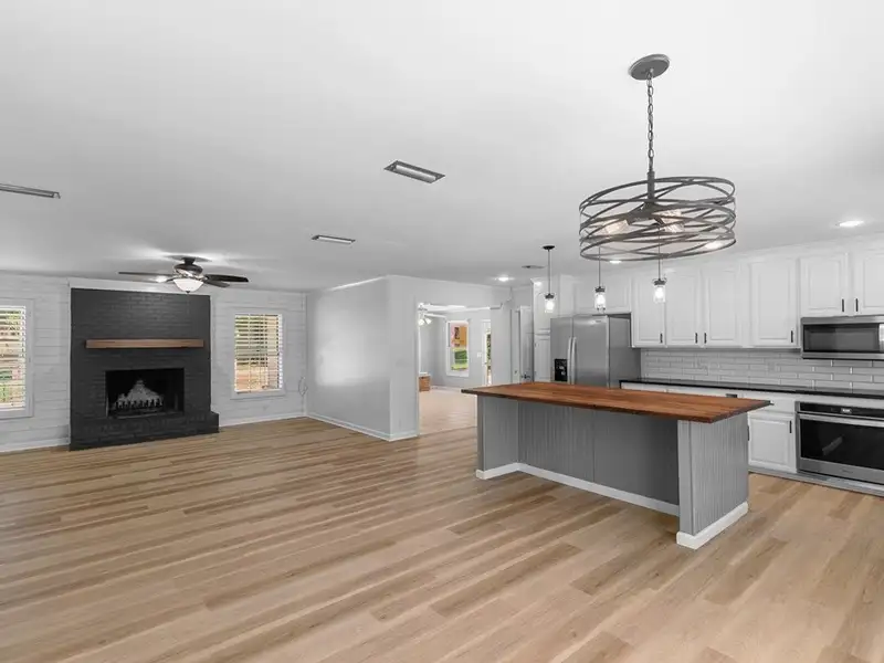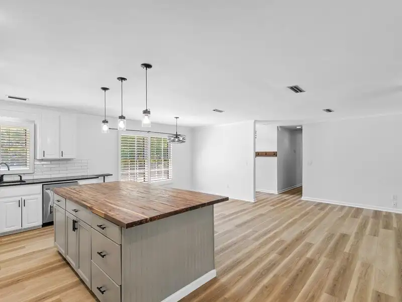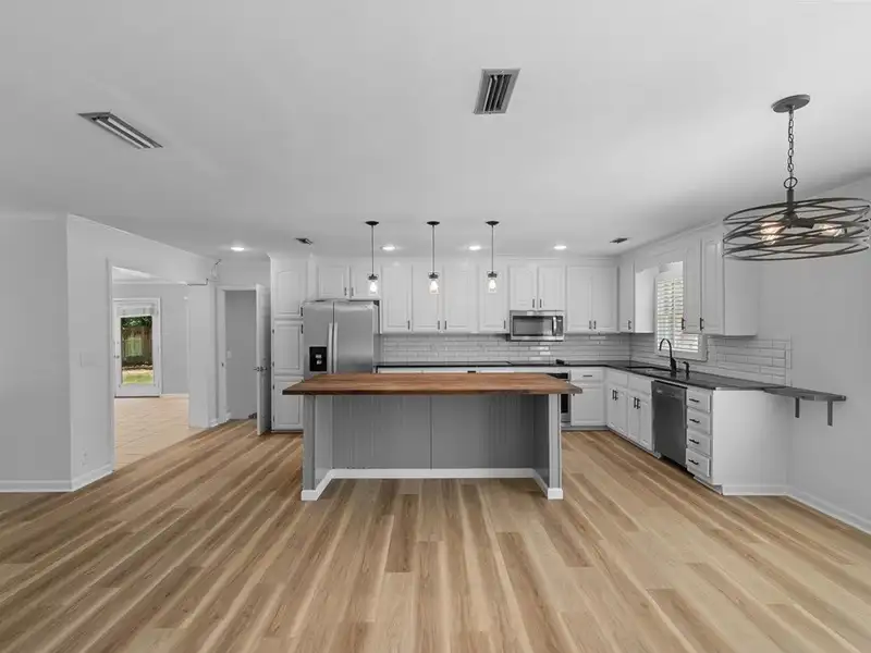 - Kitchen with butcher block island and granite