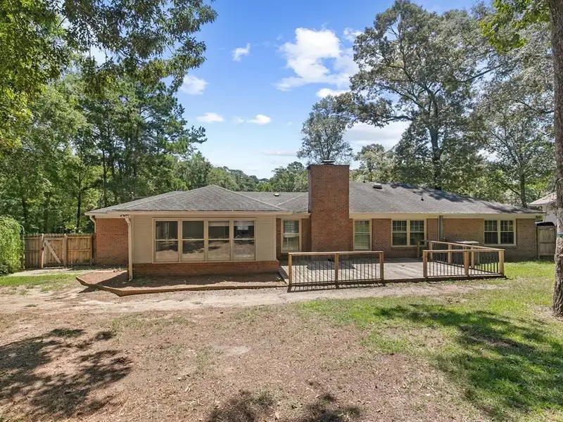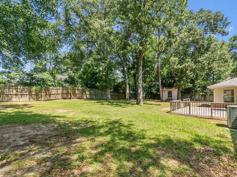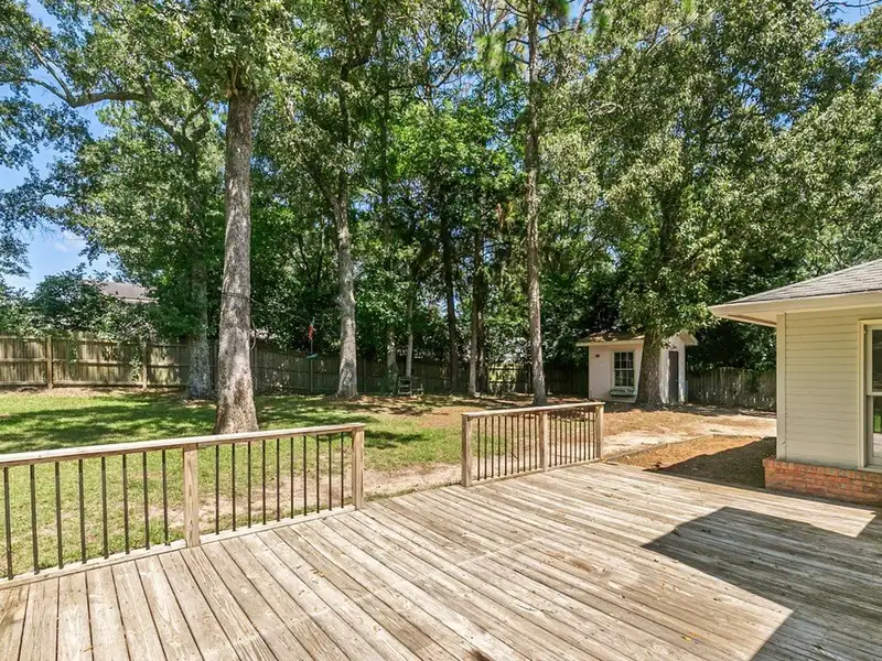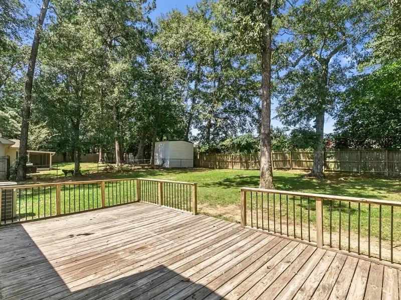 - Large backyard with deck and storage buildings