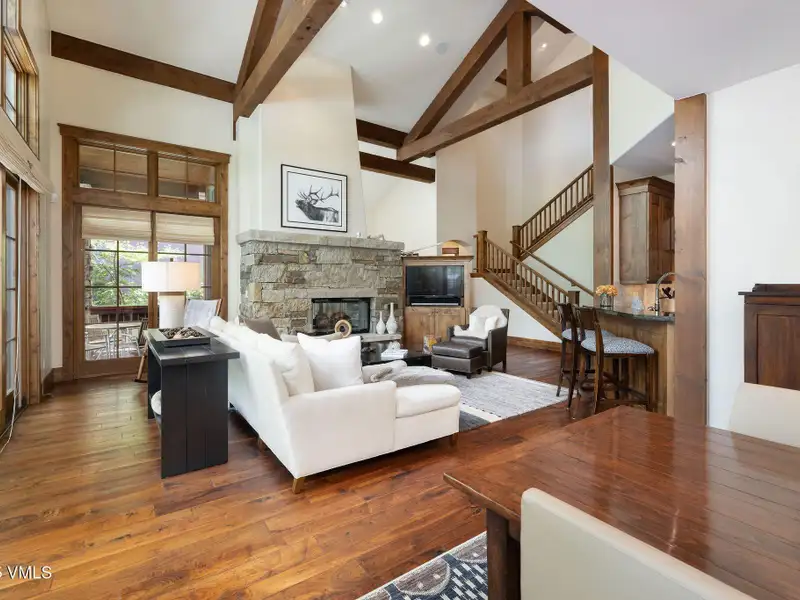 - High vaulted ceilings with wood beams
