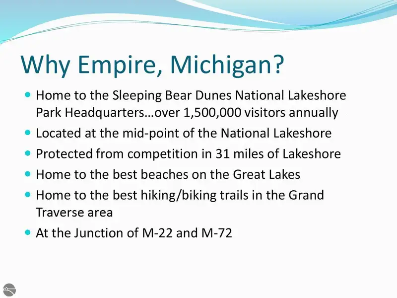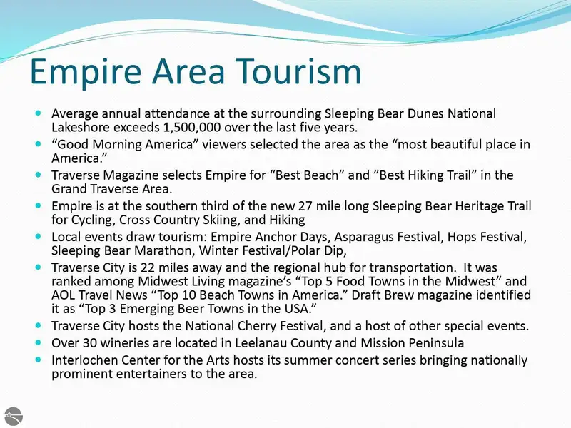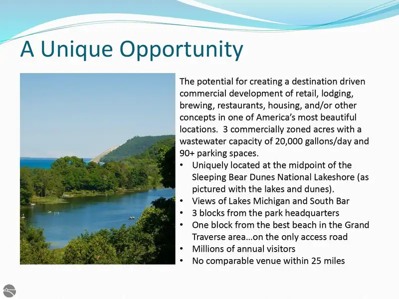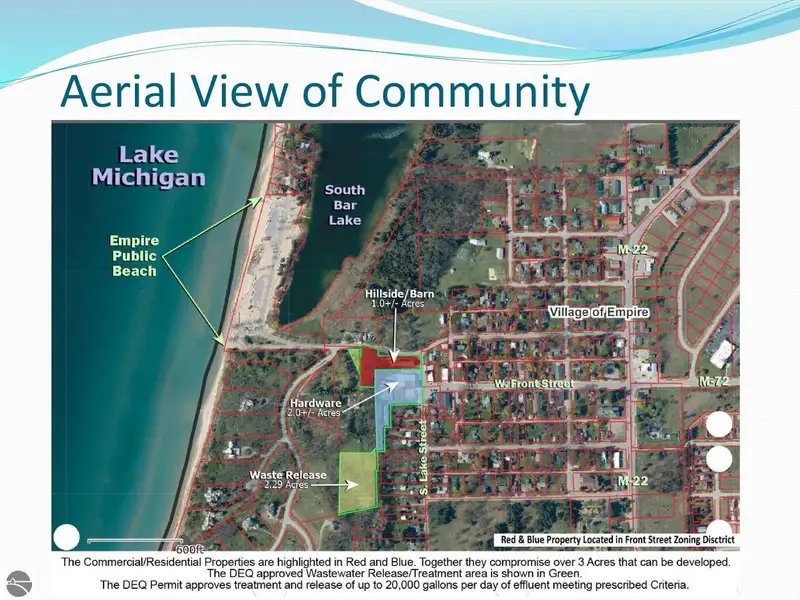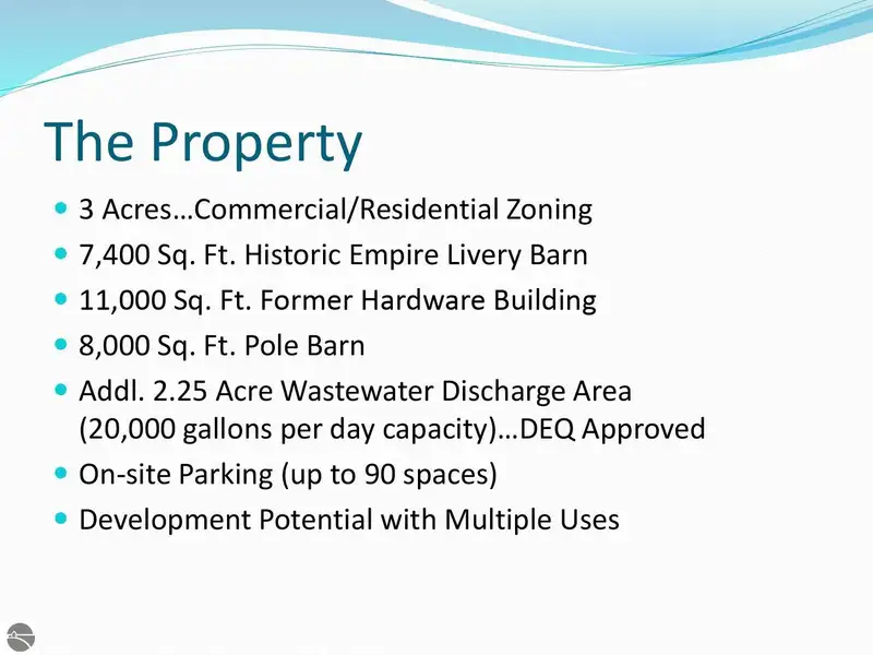 Located at the center of the Village of Empire, and just steps away from Lake Michigan and S. Bar Lake Beaches, all surrounded by the beauty of the Sleeping Bear National Park. This 5.34-Acre property includes a Historic, 2 level Livery Barn (7,400 sq ft); former Hardware Store (11,000 sq ft); Pole Building (8,000 sq ft); and 2 Sheds (for Lumber Yard Horizontal storage). (NOTE: "Concept Site Plans" and "Concept Drawings" shown in attached photos, are also included in Associated Documents for easier viewing) Property is zoned Commercial-Residential and is located in the Front Street Zoning District, which allows a wide range of potential uses (For details, Click the Documents Link button for a copy of the Front Street District Zoning Ordinance, along with the Empire Zoning Map). This development property is also supported by a contiguous, 2.29 acre approved septic field (Release Area) with a capacity of up to 20,000 gallons-per-day, the Release Area is included in this sale. Property also has access to the following utilities: Natural Gas; Municipal water; and Spectrum high speed Internet, TV and telephone. Listing data and information, including year built, measurements, square footage totals for Buildings, Zoning/Building details, Tax ID#'s, and supplemental Documents have been obtained from third party sources and /or the Seller; all data and information is deemed reliable but cannot be guaranteed for accuracy; independent verification should be made by Purchaser and Purchaser's Agent prior to Closing.