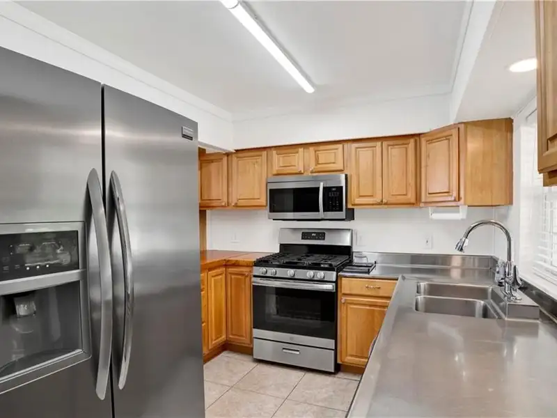 - Kitchen with stainless steel countertop and gas range