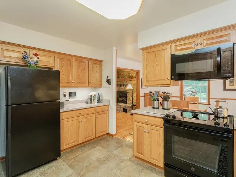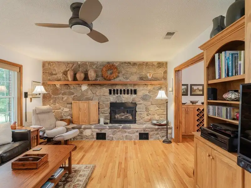 - Stone fireplace with gas log insert