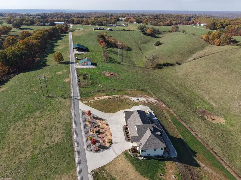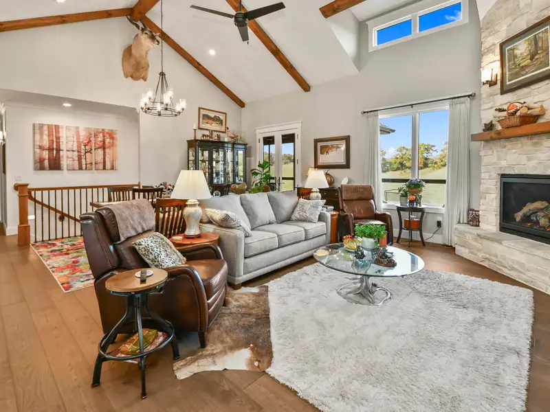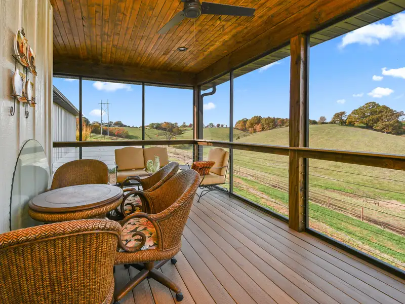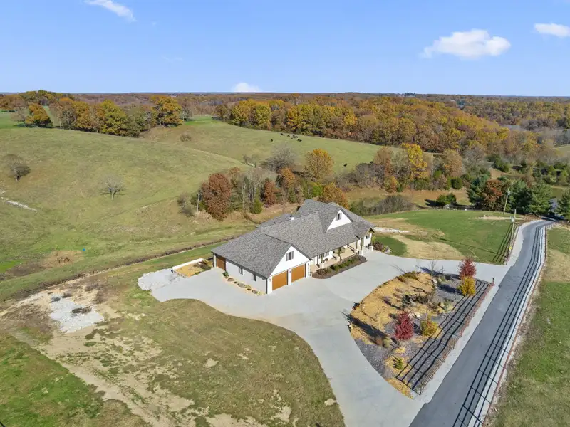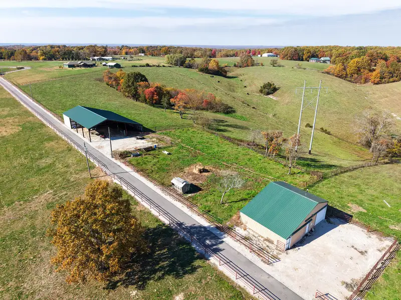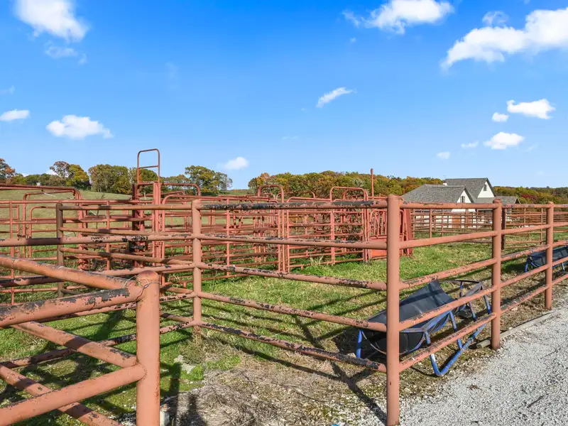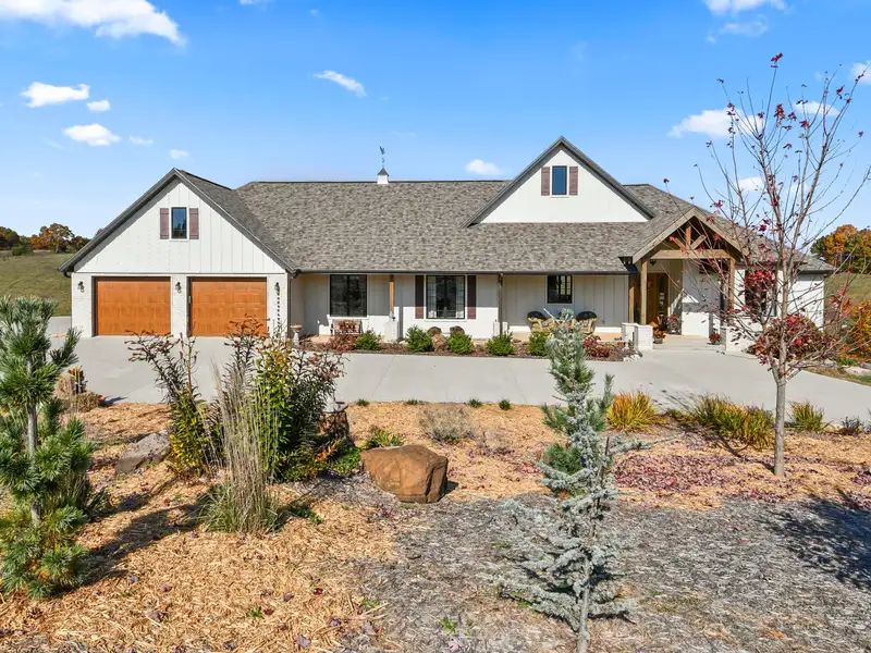 GREEN ACRES IS THE PLACE TO BE! Farm livin really is the life for you ---- only this isn't Hooterville! Enjoy the perfect blend of country privacy and city convenience with all paved roads leading right to your door. As you meander down the asphalt drive, take in the beauty of 33 m/l rolling acres, dotted with two tranquil ponds and enclosed by welded steel pipe fencing -- ideal for cattle, horses, a hobby farm or simply soaking in the serenity. A metal hay barn (84 X 60) with tack/storage room) and a metal shop (30 X 40) with concrete floors, electricity and heat. AND THEN WE FIND THE SHOWSTOPPING HOME that's just three years young and offering over 3,700 square feet of luxury living. Exterior combines LP Smart Side Diamond Kote and brick for a stunning effect. Step inside through the welcoming beamed entry into a foyer with stunning countryside views. The living room features a vaulted beamed ceiling, floor-to-ceiling stone fireplace (vented propane) and expansive windows that fill the space with light and scenery. The open floor plan flows effortlessly into a chef's dream kitchen, highlighted by a 5' X 7' matte quartz island with seating, prep sink, five-burner induction cooktop and abundant workspace. Elegant cabinetry combines open shelving, glass fronts and solid doors, all illuminated by over, under and interior cabinet lighting -- perfect for showcasing your treasures. Two walk-in pantries flank the sink area (one currently being used as a small office). Step out to the large screened deck with its tongue-and-groove ceiling and enjoy peaceful mornings or golden sunsets over the rolling pastures. The primary suite is a true retreat with open deck access. French door walk-in closet, curbless tile shower, freestanding soaking tub, large linen closet and spacious raised double vanity. Down the hall, you'll discover two additional large bedrooms, a 3/4 bath, laundry and mud room, plus a flex space currently used as a sewing center. The oversized, zero-entry, three-car garage wired for EV charger is a dream. Most interior doorways are 36 wide. New roof and gutters installed in 2025 due to hail damage. Making your way down the stately stairway to the lower level, you'll be met by the generously sized family room with another floor-to-ceiling brick and stone vented propane fireplace. Two additional bedrooms, a full bath and huge mechanical/storage area complete the picture. All this tranquility, yet just 12 minutes to shopping, dining, grocery and medical care, and only 30 minutes to Branson. Come see where luxury meets laid-back country living -- YOUR Green Acres dream awaits at 74 Hunters Drive. Need More? There is an 12 X 30 boat slip with lift available for additional. Beautiful concrete dock and in one of the best crappie fishing holes on Table Rock.