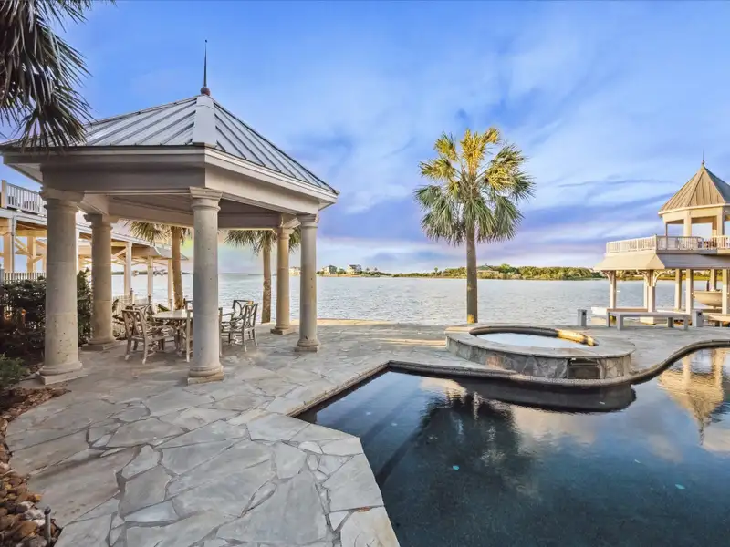 - Pool with flagstone decking and gazebo