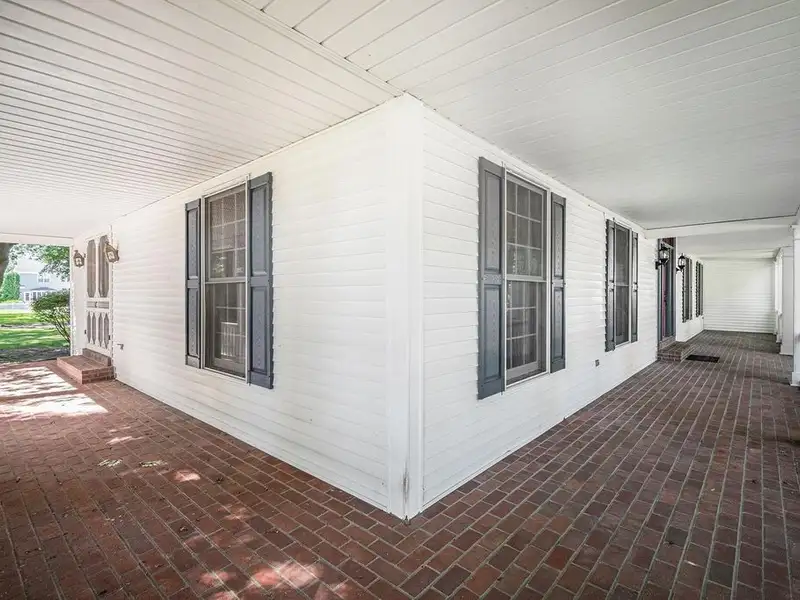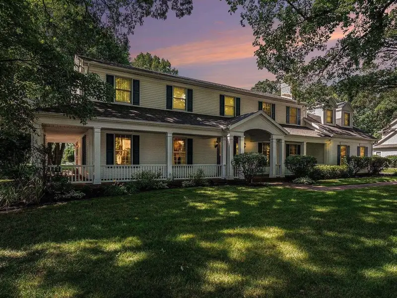 - Wraparound porch on tree-lined street