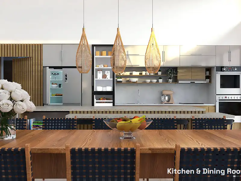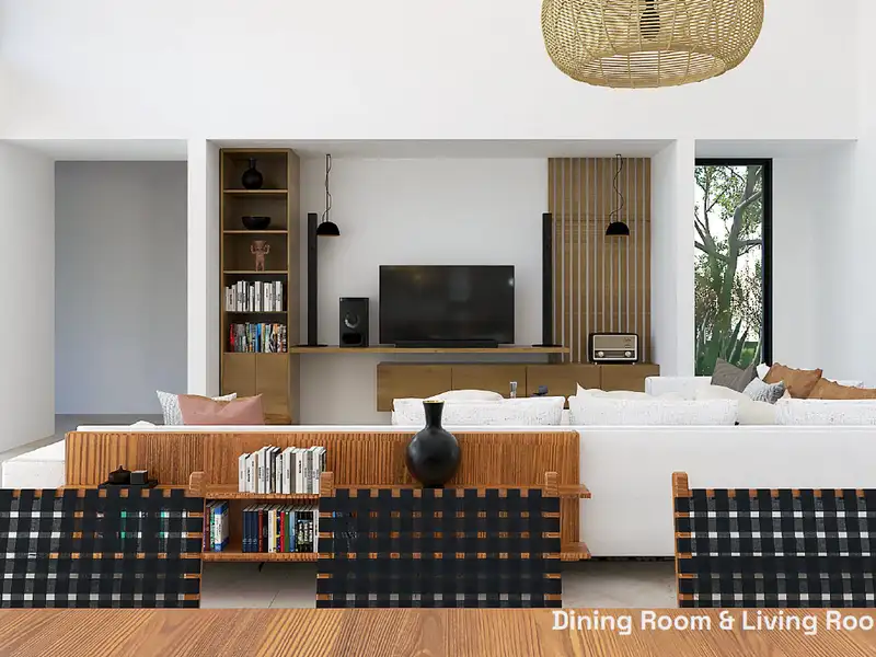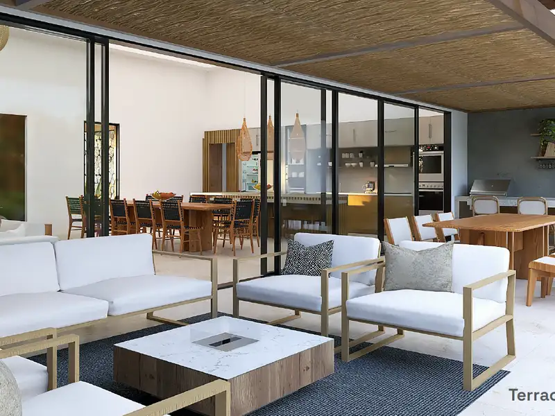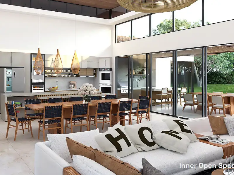 The heart of the home is its expansive open-plan living area, graced by soaring double-height ceilings and bathed in natural light. Walls of glass blur the boundaries between inside and out, leading to a vast terrace with a fully equipped outdoor kitchen, al fresco dining area, and inviting spaces to relax or entertain.
