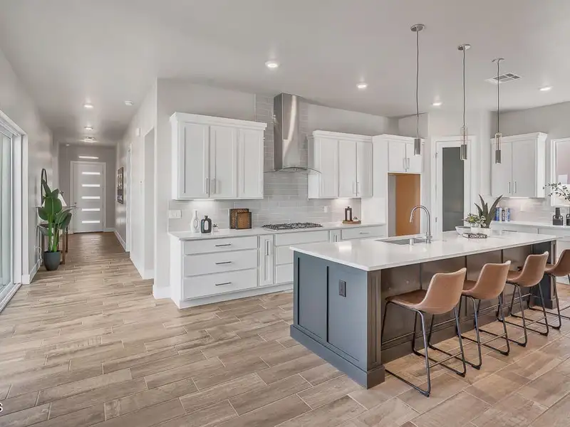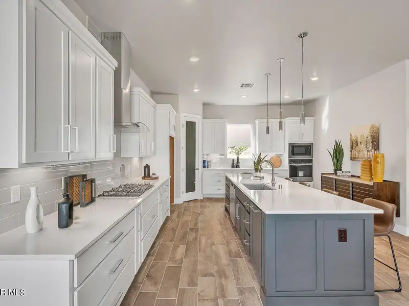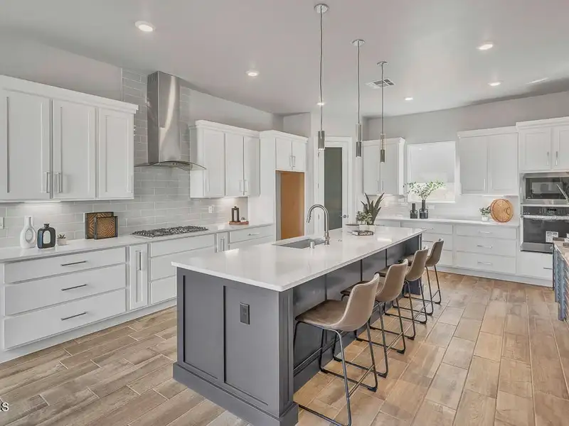 - Kitchen with granite countertops and island