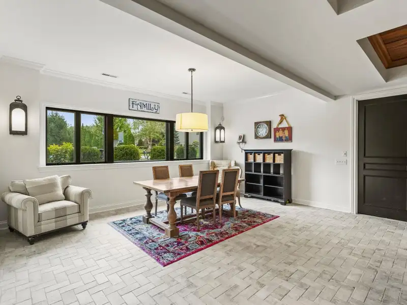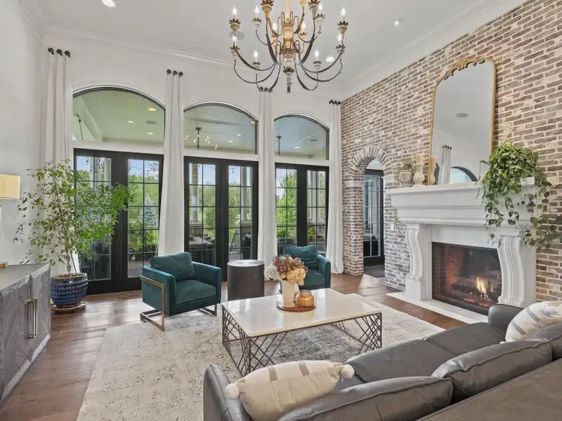 - Great room with limestone fireplace and French doors