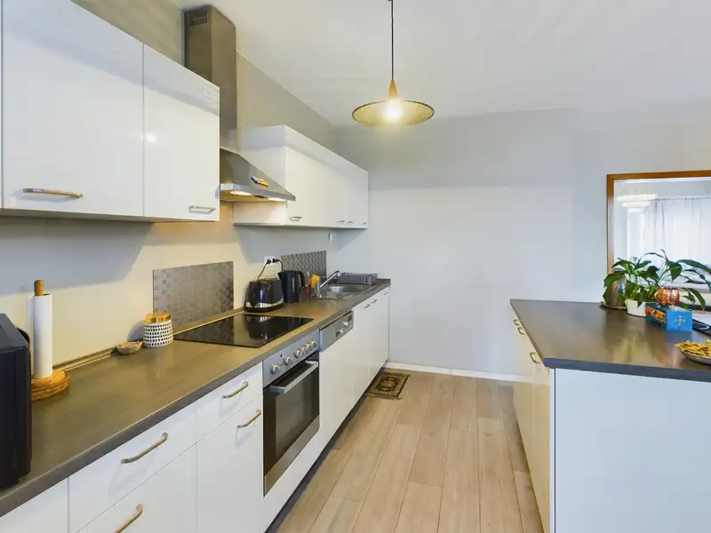 - Open-plan fitted kitchen with garden access