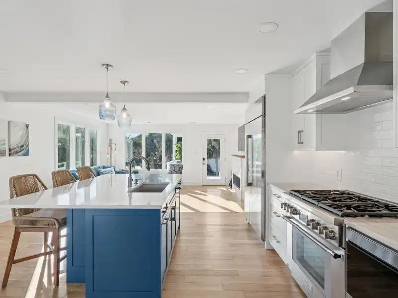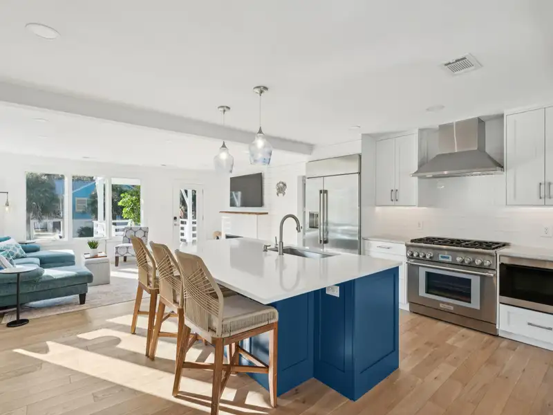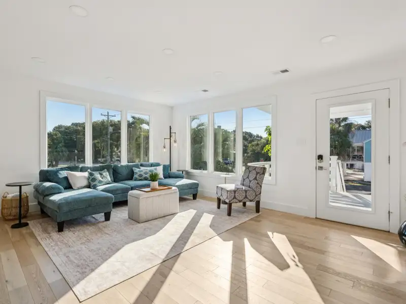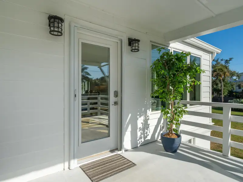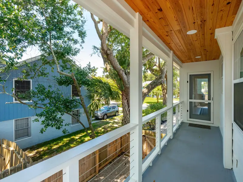 Steps to the Beach! This classic beach house sits on a large corner lot just one block from the 25th Avenue beach access. An original duplex, it has been fully renovated with modern finishes while retaining its island charm. With new roofing, flooring, kitchens, bathrooms, electrical, plumbing, garage, and custom porches, this home is move-in ready with endless potential. Live in one unit and rent the other, create a dedicated guest suite, or convert to a spacious single-family home - the choice is yours! **Note: Listing agent is the seller.**Enter the upstairs unit through the covered front porch with conversational seating as well as an open deck area with views of palm trees in every direction. The upstairs has beautiful new hardwood flooring throughout. The open floor plan and large windows paint the room with natural light and great views of the surrounding trees.The gourmet kitchen is appointed with a professional gas range and vented hood, dishwasher, 42 inch built in refrigerator with filtered water and ice machine, built in microwave drawer with hidden control panel, a large island with sink and seating on three sides and a bar area with under counter beverage refrigerator. Enjoy dining and entertaining in the spacious, treehouse-style dining area surrounded by beautiful views and decorated with a gorgeous natural wood ceiling. Extra large storm resistant sliding glass doors provide access from the dining area to an uncovered deck for grilling and enjoying the sunshine.