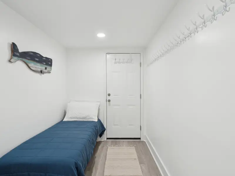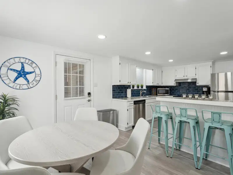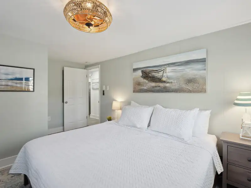 Enter the downstairs unit through a screened porch with outdoor seating and a wall fan to keep you cool on a warm summer day. The large, open living room, dining, and kitchen area are designed for entertaining with plenty of room for seating and a full sized kitchen. Luxury vinyl flooring provides a light and beautiful look that is also easy to care for. Down the hall, there are two large bedrooms that each accommodate king sized beds. One has a reach-in closet and the other has a walk in closet. A full bathroom in the hall is shared. A bonus room for overflow, office, or playroom area provides access to the downstairs laundry and utility storage area. Three exterior doors on the laundry area allow for easy access to bikes and could be divided to provide half to upstairs and half to downstairs units.