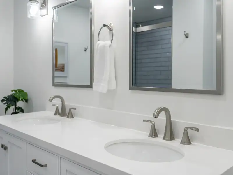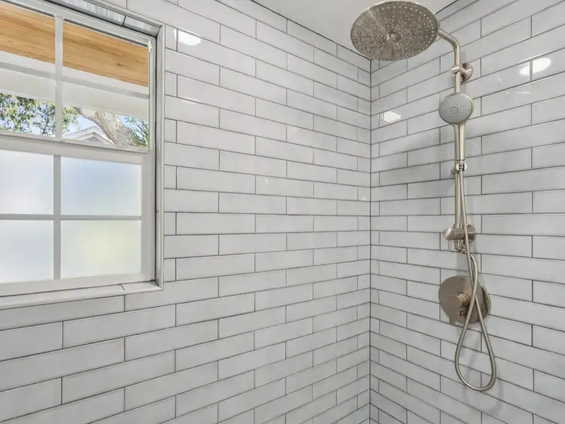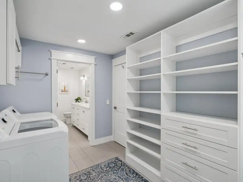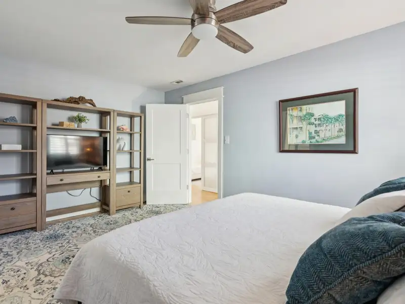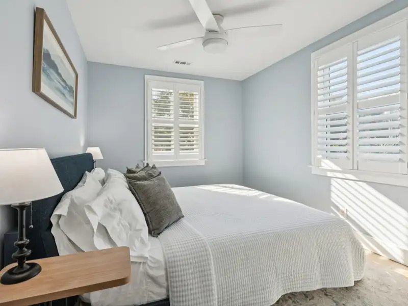 The upstairs primary bedroom is large enough to accommodate a king sized bed and large dresser. A walk in closet with custom organization provides drawers, shelves and racks for clothing storage as well as a full sized washer and dryer. The primary bathroom includes an oversized shower, dual sinks, and custom built closet & drawers. The second bedroom is large enough to accommodate a king sized bed with a reach-in closet for clothing and two windows offering plenty of light. Both bedrooms have custom wood shutters on the windows. Flexible third bedroom/office with exterior doors to the front porch and full sized stairs to extensive attic space, conditioned and insulated for storage, and an additional closet under the stairs. The second upstairs bathroom includes an extra deep soaking tub and mermaid tiles on the back wall.