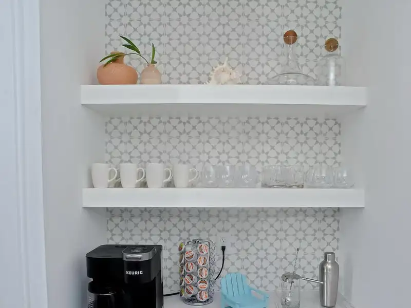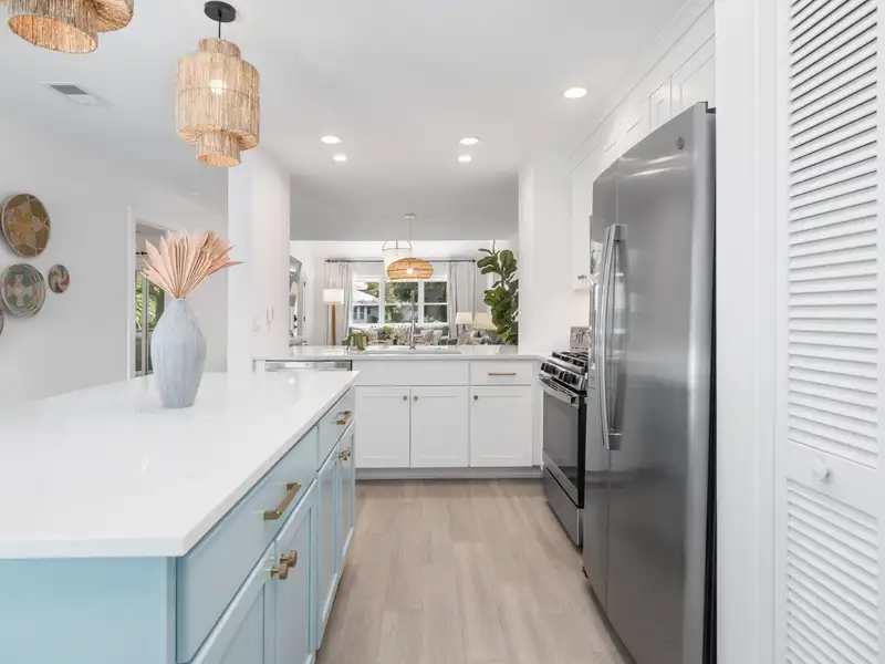 The three-bedroom, two-bath layout features a spacious open and updated kitchen with slow-close custom cabinetry, new quartz countertops throughout including island, eat-in bar and coffee/beverage station. Thoughtful updates include new fixtures, lighting and appliances. A full laundry area adds everyday convenience.