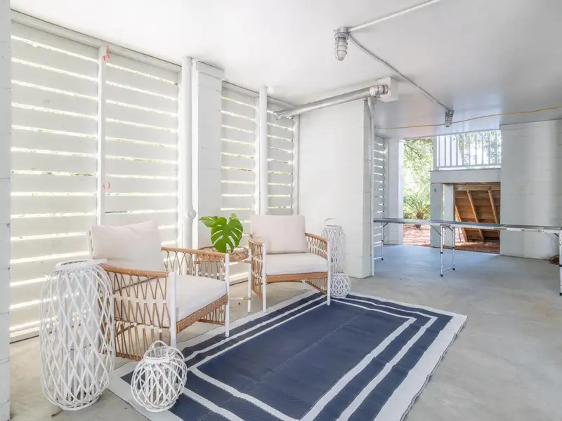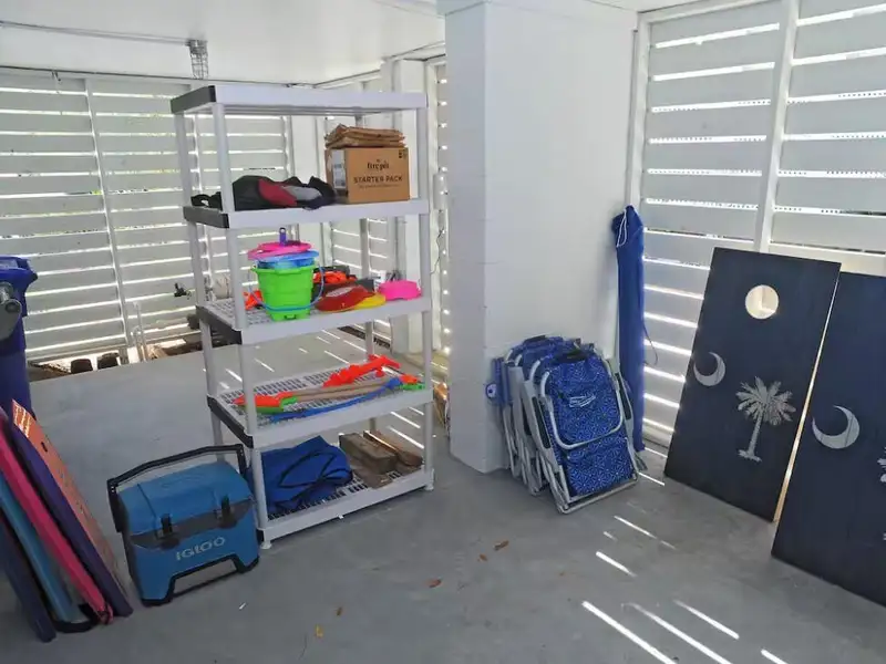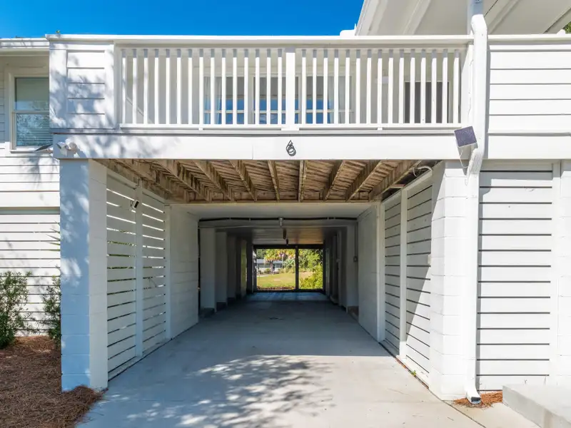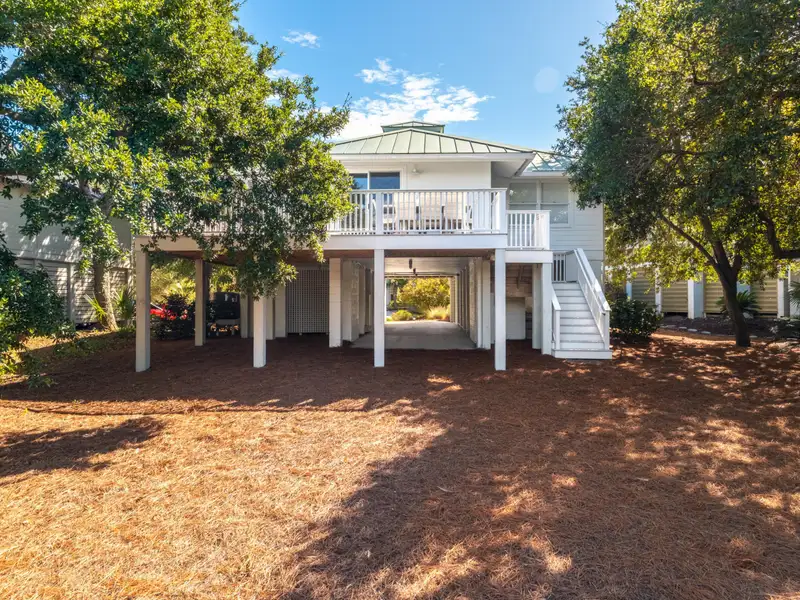 The bungalow's drive-under elevated design provides for fun times while awaiting a tropical sprinkle to pass...sitting area, game space, private outdoor shower and multi-storage areas are essential beach house needs. The area offers covered parking for three cars-the maximum amount allowed by the community. The entire under portion and driveway were also recently poured with fresh concrete and wood decking in 2022. Essential coastal elements of metal roof and hardiplank siding complete the exterior.