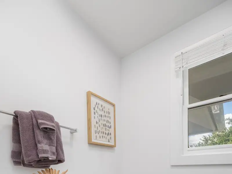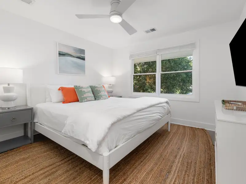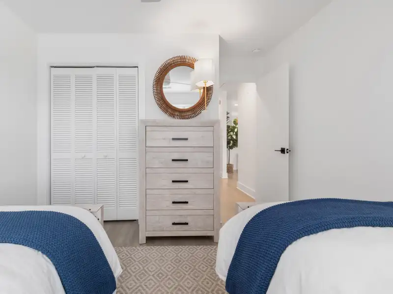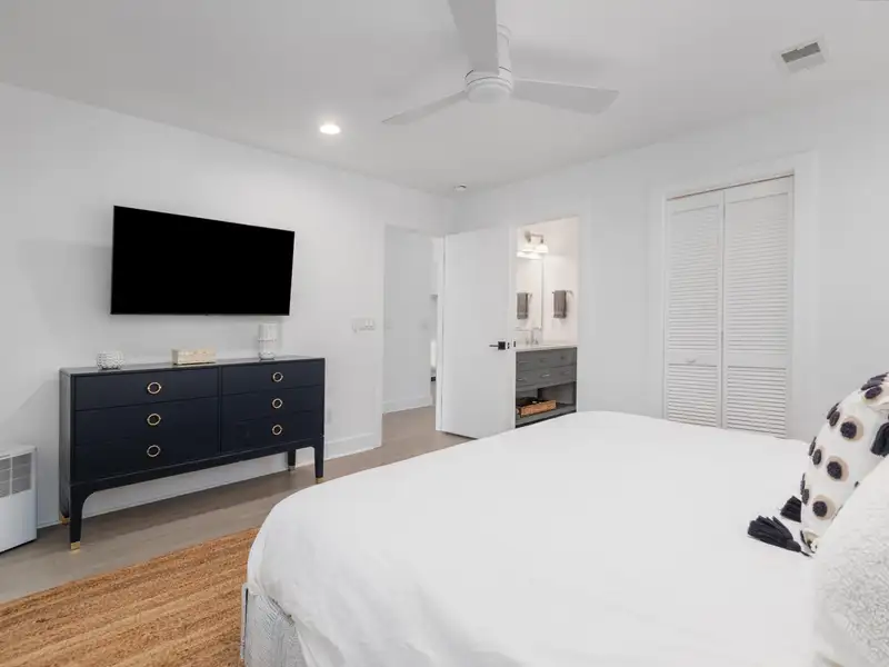 The owner's suite features a bathroom with updated dual vanity quartz countertops and drawer space to compliment a stunning azure tiled large shower. Walk-in closet with wood shelving and plenty of main room space for king bed and side tables and lighting. Two additional bedrooms provide flexible living options as a tv room/office with one guest room. Rounding out the floorplan is a guest bath convenient to both bedrooms.