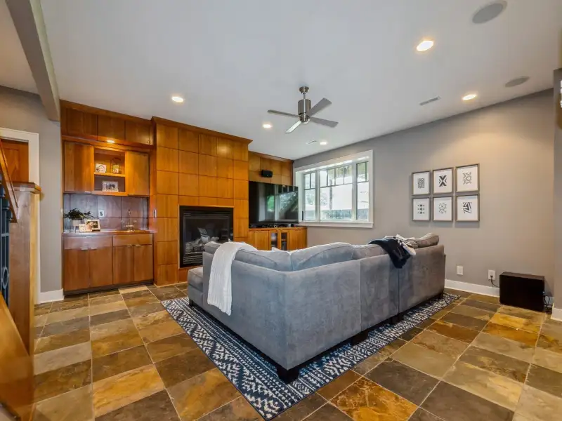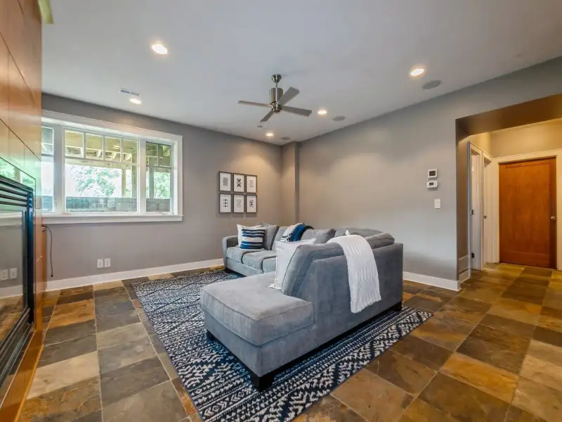 - Soaring ceilings with stone fireplace