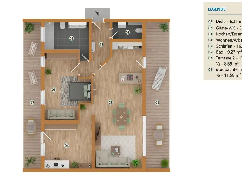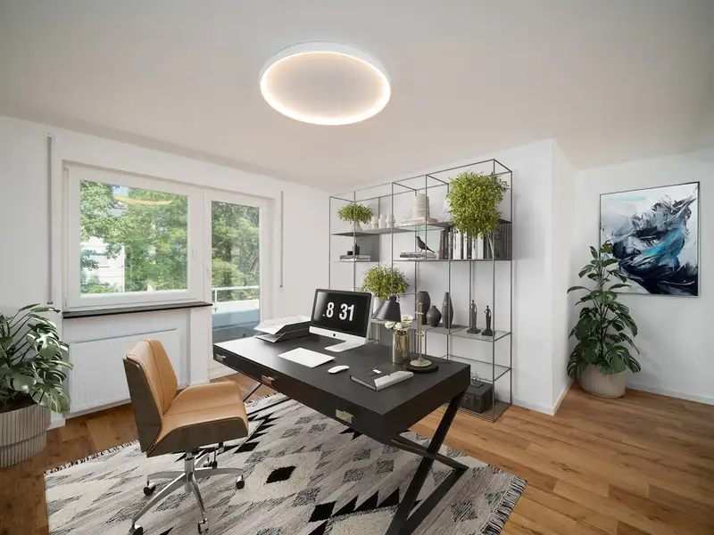 There is also a spacious bedroom in the apartment with access to the north-west-facing terrace, which offers plenty of space for relaxation and recreation. The room design allows for the integration of a spacious closet or dressing area. A further open room offers flexible usage options, whether as a home office, guest room or hobby area. From here you also have access to the large north-west-facing terrace. The apartment offers plenty of sun and shade thanks to the two terraces facing different directions, perfect for all seasons.