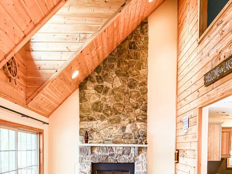 - Floor-to-ceiling stone fireplace