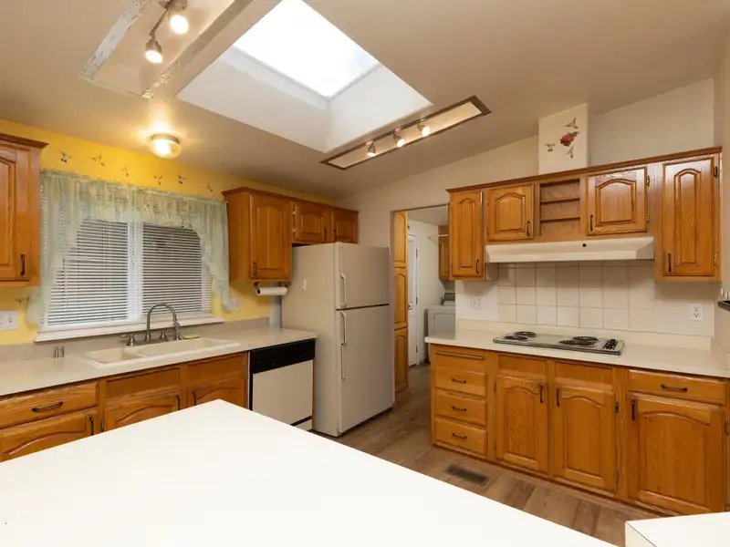 - Open kitchen with oak cabinets