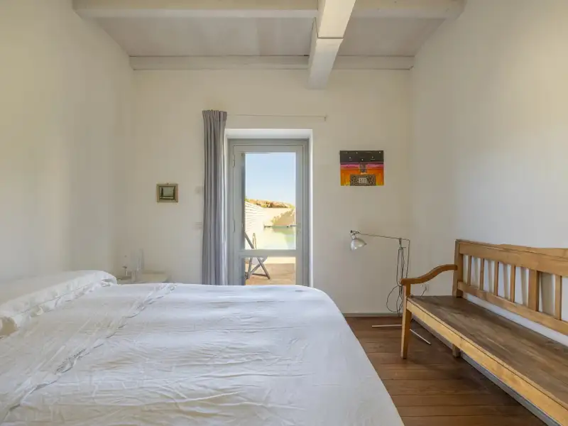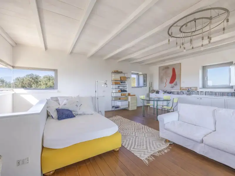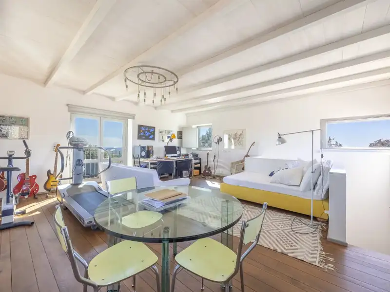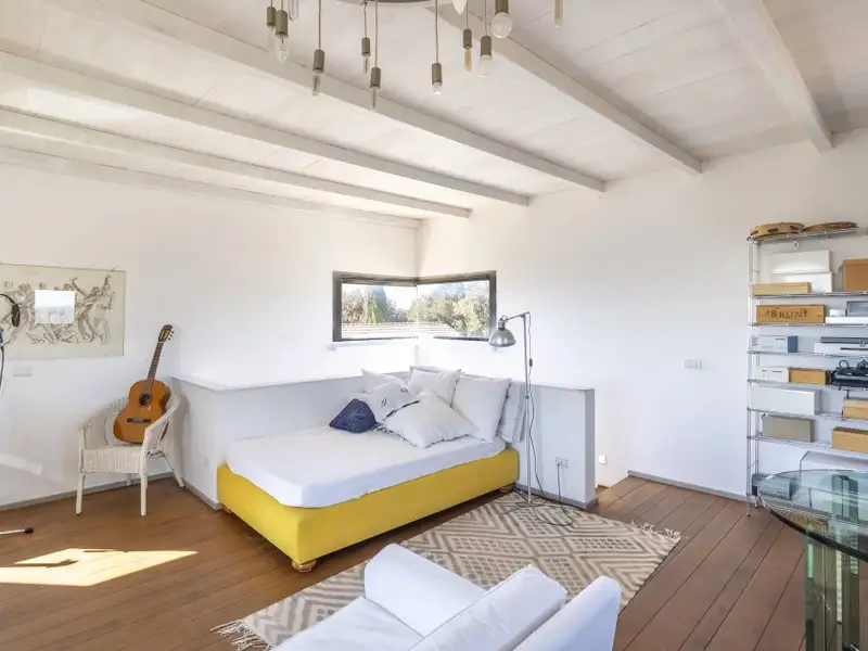 The elegant and functional sleeping area, includes a master suite with walk-in wardrobe and en-suite bathroom, two additional double bedrooms, a second bathroom, and a charming room in the tower ideal as a fourth bedroom or a study with a view. The two wings of the villa are connected by a bright glass hallway that could become a splendid library or art gallery.