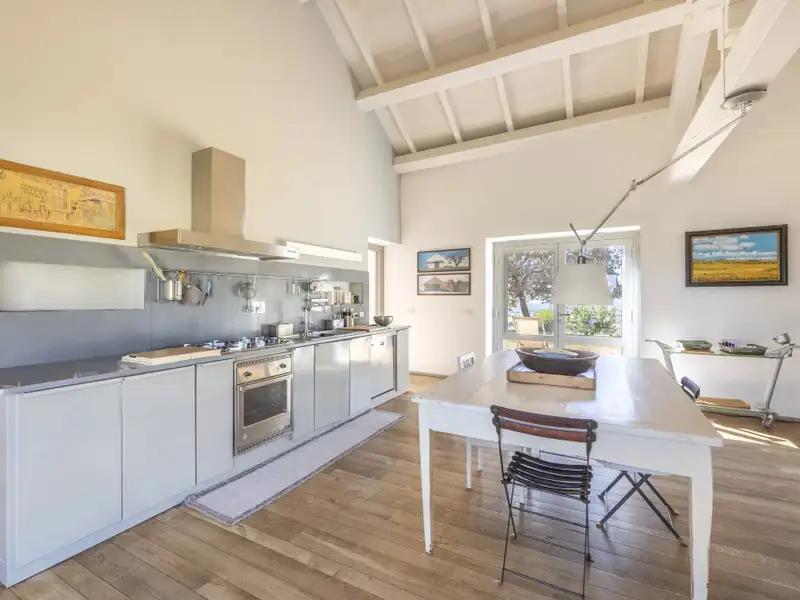 In one of the most authentic and unspoiled landscapes of Tuscany, among the gentle Maremma hills and just a few kilometers from Capalbio, stands this extraordinary villa, nestled within an enchanting olive grove. A residence that captivates with its dominant position, offering breathtaking views of the sea and the island of Giannutri: a panorama that changes color throughout the day, glowing fiery red at sunset.