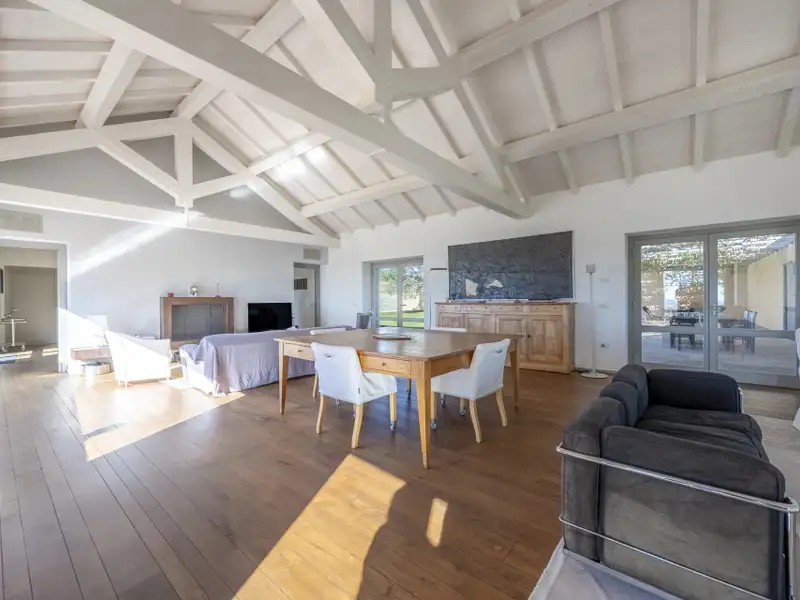 Upon entering, a grand living room with trussed ceilings and large windows opening on three sides welcomes you with light and space. Here, the sitting area, fireplace corner, and dining area coexist in an atmosphere of refined conviviality. Adjacent lies the spacious eat-in kitchen with a large table—the beating heart of the house—inviting shared moments of taste and familiarity.