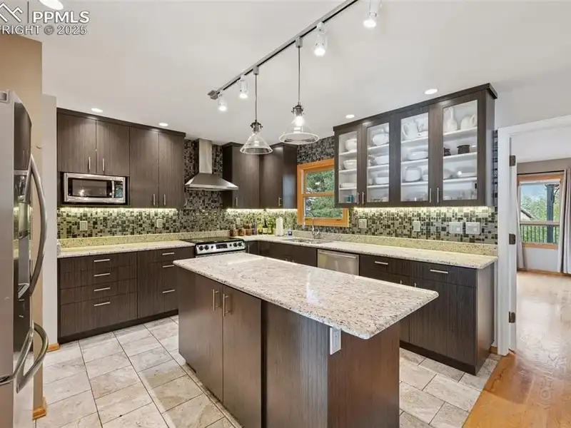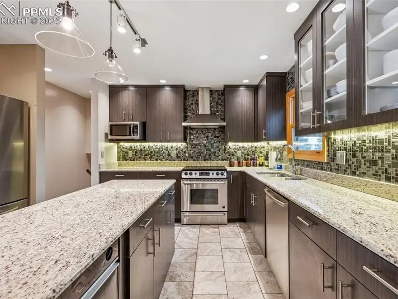 - Large gourmet kitchen with granite countertops