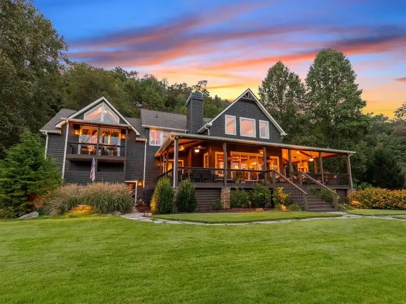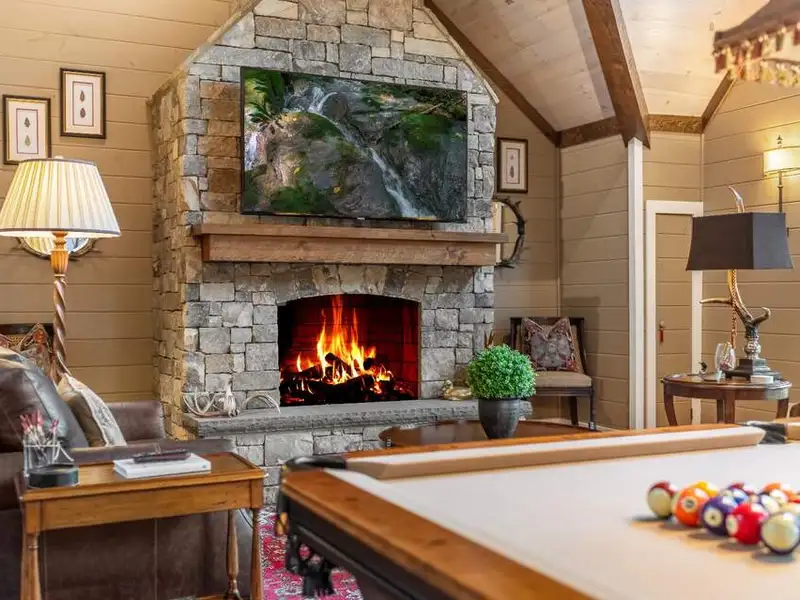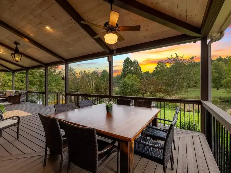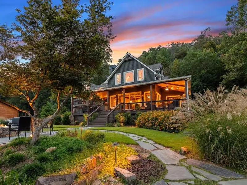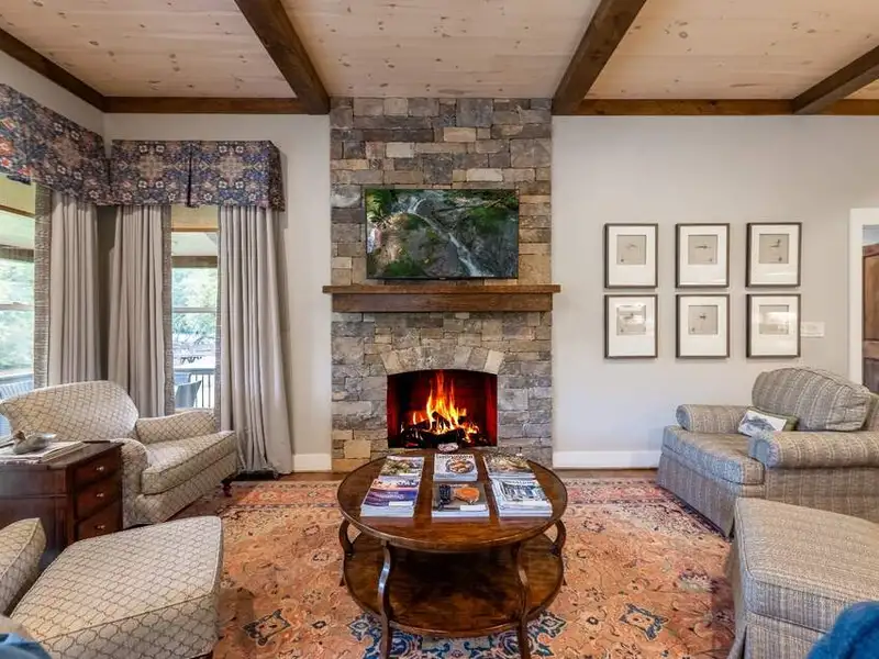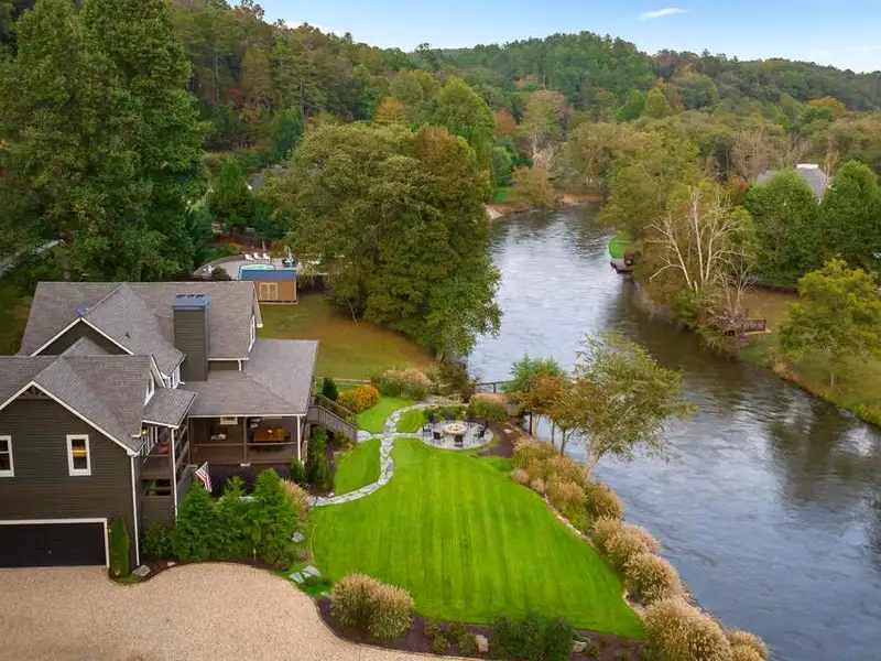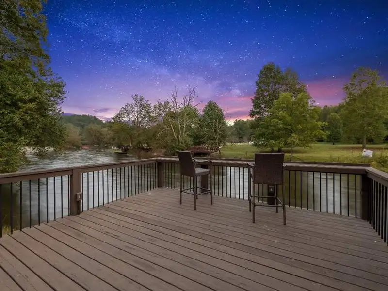 River's Edge is a 6 BR/5BA fully furnished home with 114' of Toccoa River frontage. It underwent a complete remodel and landscape enhancement in 2020, with interior design provided by Cindy Trimble of Studio Trimble Design, Inc of Blue Ridge, GA. The home has 5643 (+/-) heated and cooled sq. ft., 1,400 sq. ft. of covered front porch, 1,600 sq. ft. of porch facing the river, 16x16 deck extending over the river, a hot tub, and rock fire-pit. The kitchen, living, and dining areas are all open with lots of counter space for cooking and entertaining. Wide-plank eastern pine floors are featured throughout, with Persian rugs and tasteful d+cor that provide a sophisticated lodge feel. The home has three master suites, two on the main floor and one on the second floor. The second-floor master suite features three closets, double vanity sinks, large walk-in shower with separate soaker tub, and heated floors. The second floor also has a bedroom with three single beds and one double bed, plus a full bathroom. The basement has a large living area; two bedrooms, one with a queen bed, and one with four full beds; a full bathroom with double sinks, and walk-in shower. There are four Fieldstone fireplaces in the home. Located above the garage is a bonus/billiards room with vaulted ceiling, bar, and private balcony. Outdoor area includes grill, entertainment area, professionally landscaped yard, underground drainage, irrigation system, accent lighting, and camera system.