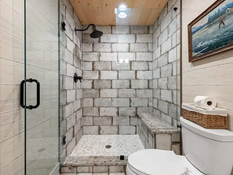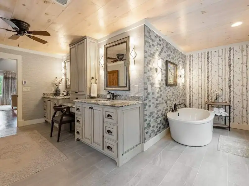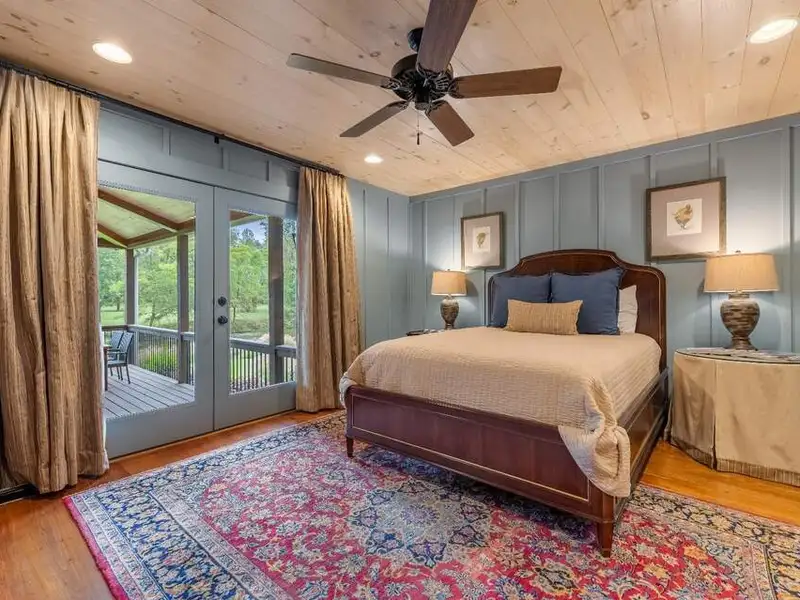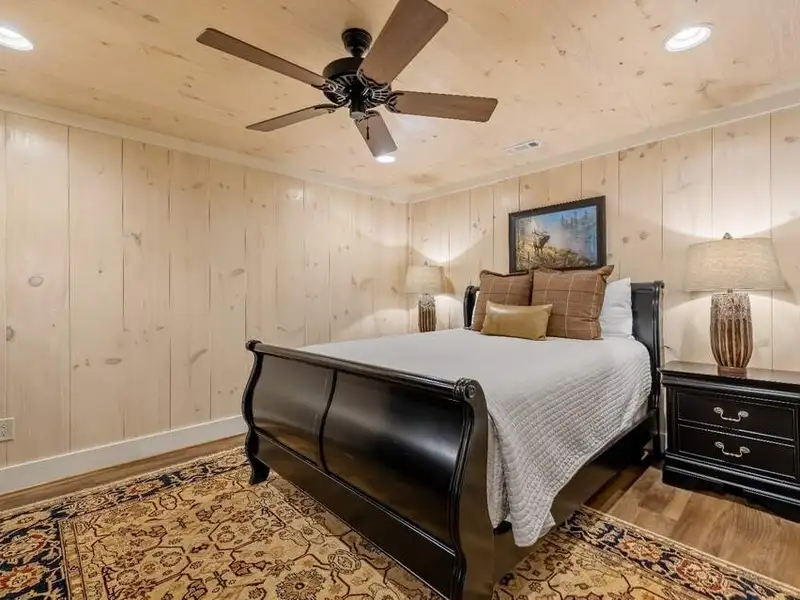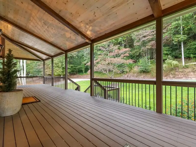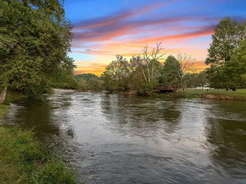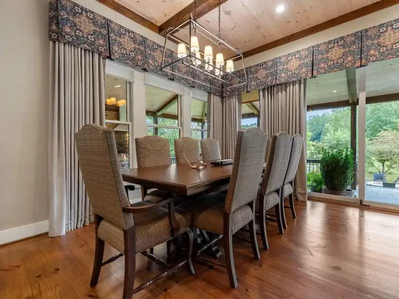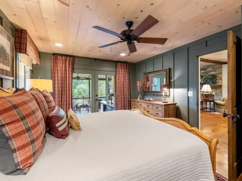 River's Edge is a 6 BR/5BA fully furnished home with 114' of Toccoa River frontage. It underwent a complete remodel and landscape enhancement in 2020, with interior design provided by Cindy Trimble of Studio Trimble Design, Inc of Blue Ridge, GA. The home has 5643 (+/-) heated and cooled sq. ft., 1,400 sq. ft. of covered front porch, 1,600 sq. ft. of porch facing the river, 16x16 deck extending over the river, a hot tub, and rock fire-pit. The kitchen, living, and dining areas are all open with lots of counter space for cooking and entertaining. Wide-plank eastern pine floors are featured throughout, with Persian rugs and tasteful d+cor that provide a sophisticated lodge feel. The home has three master suites, two on the main floor and one on the second floor. The second-floor master suite features three closets, double vanity sinks, large walk-in shower with separate soaker tub, and heated floors. The second floor also has a bedroom with three single beds and one double bed, plus a full bathroom. The basement has a large living area; two bedrooms, one with a queen bed, and one with four full beds; a full bathroom with double sinks, and walk-in shower. There are four Fieldstone fireplaces in the home. Located above the garage is a bonus/billiards room with vaulted ceiling, bar, and private balcony. Outdoor area includes grill, entertainment area, professionally landscaped yard, underground drainage, irrigation system, accent lighting, and camera system.