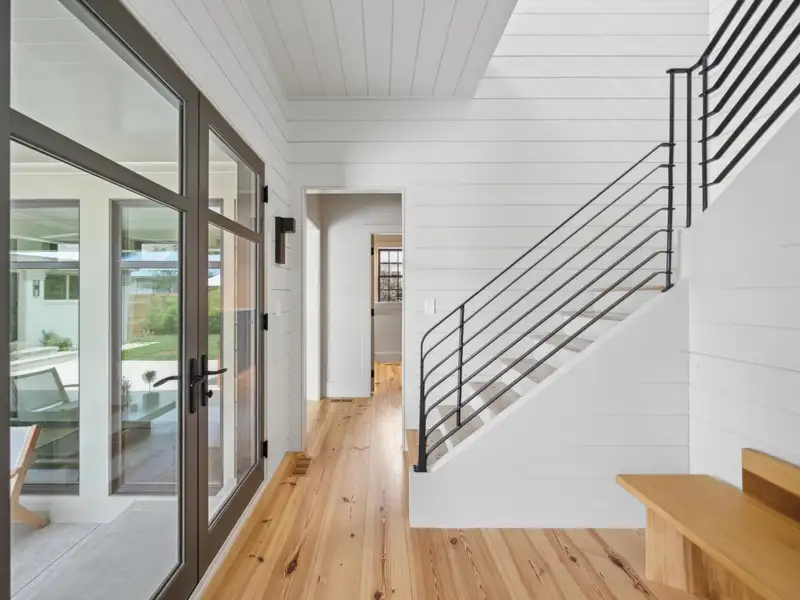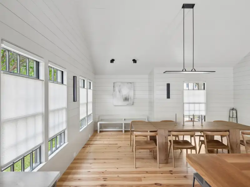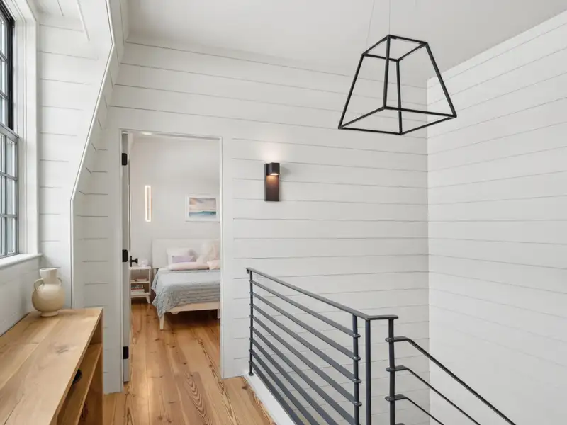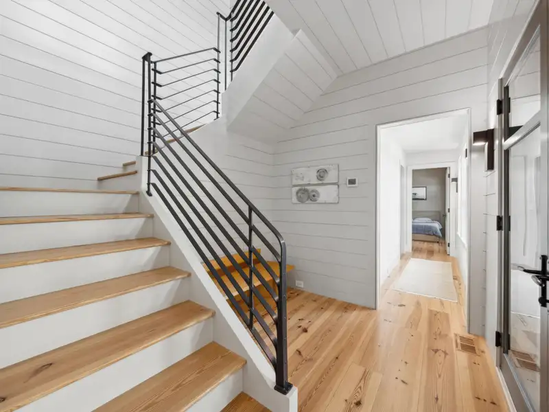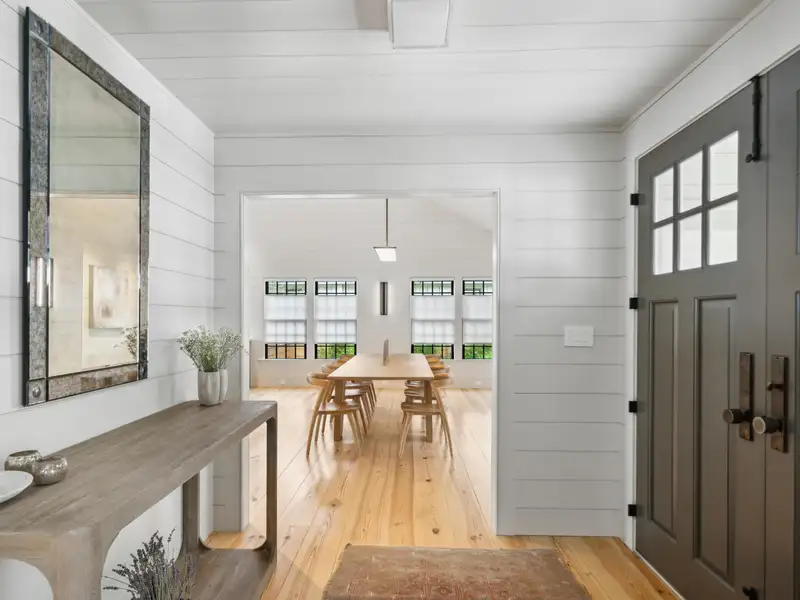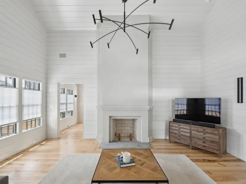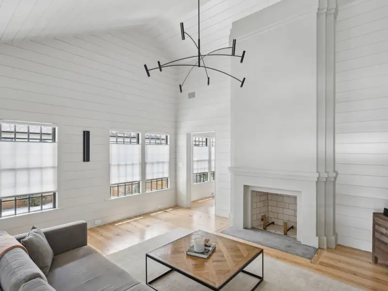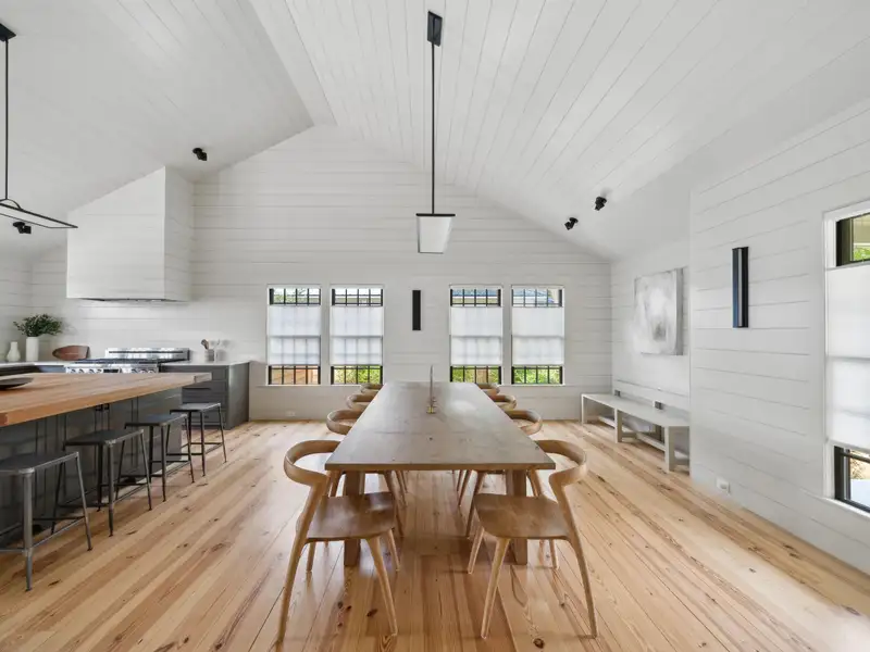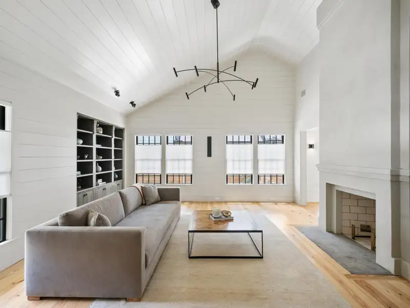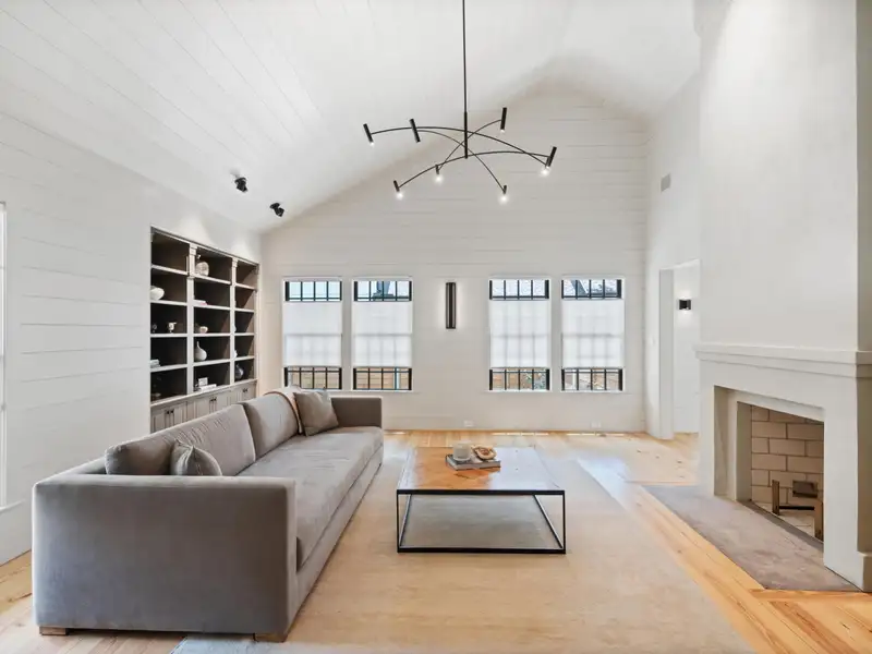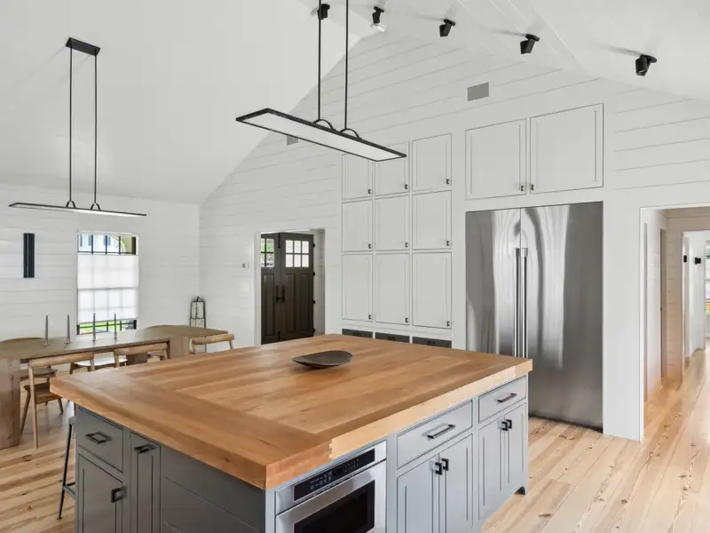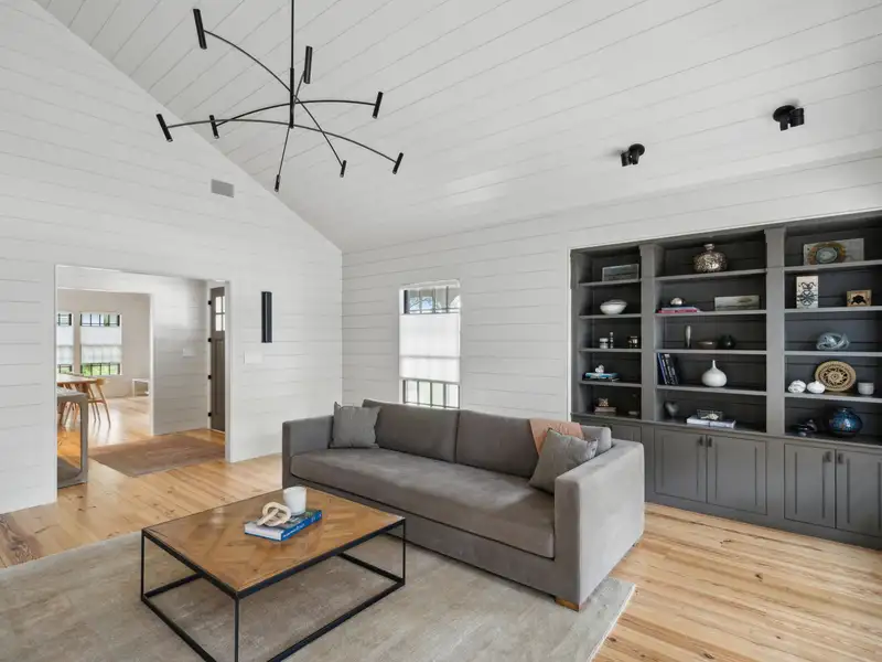 - Vaulted ceilings and reclaimed heart pine floors
