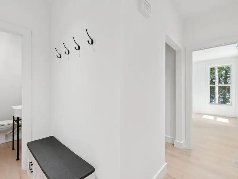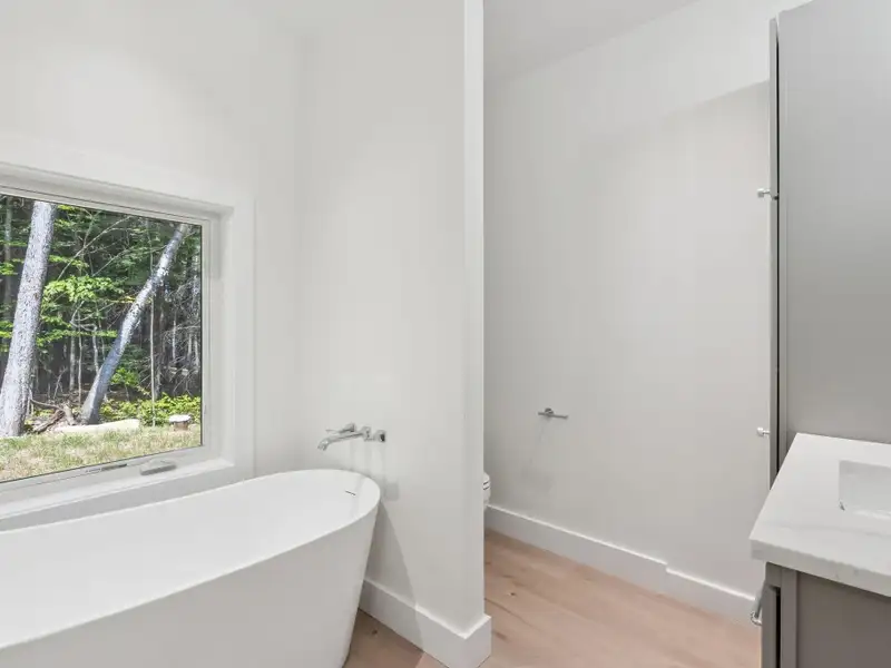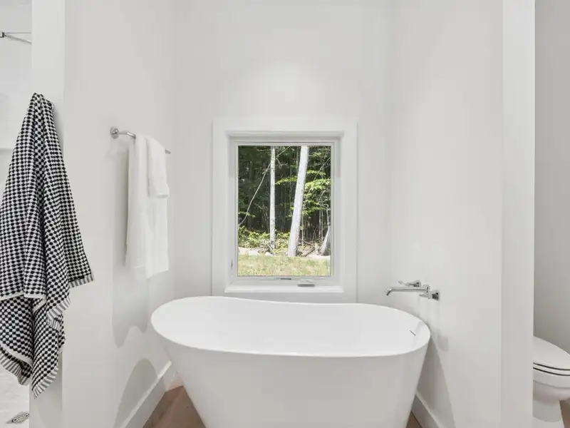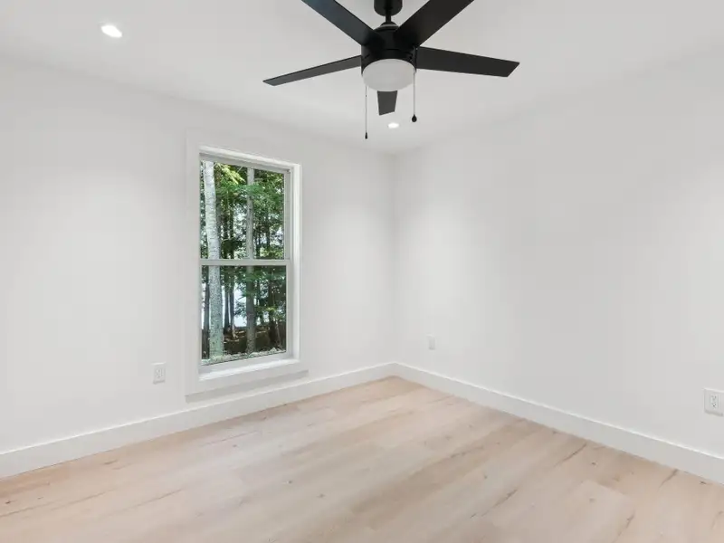 - Large windows with lake views