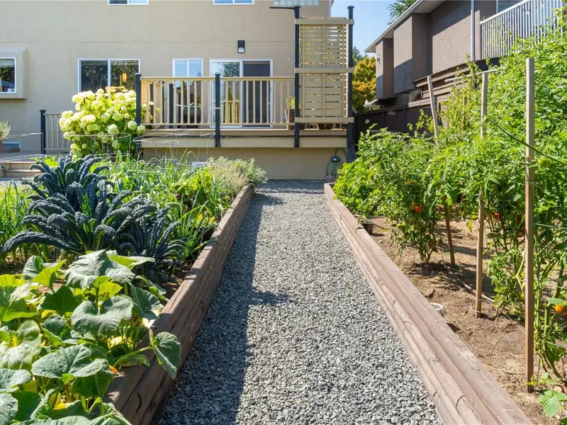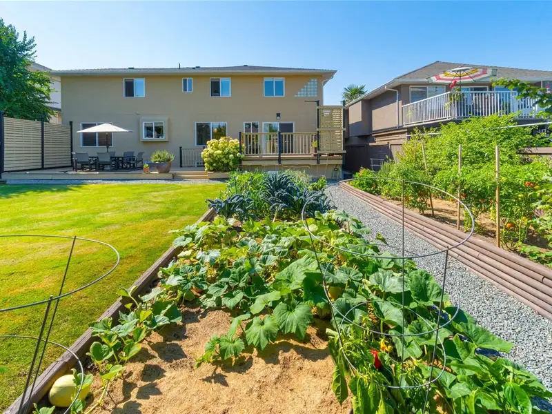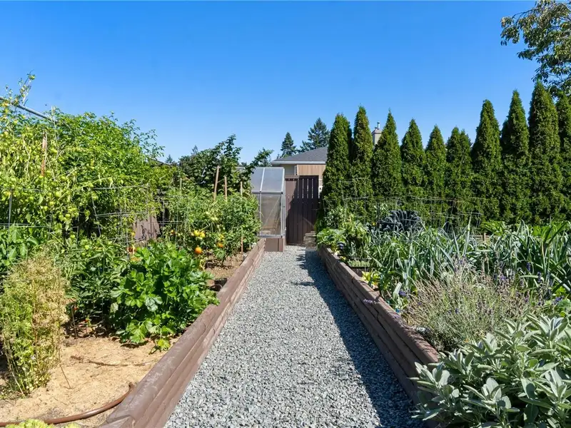 Step outside to your fully fenced private oasis with a fully irrigated vegetable and herb garden, including tomatoes, peppers, jalapenos, kale, celery, leeks, chives, rosemary, sage, cilantro, marjoram, & raspberries. A greenhouse, large deck, and grassy yard complete the space - perfect for relaxing, gardening, or entertaining.