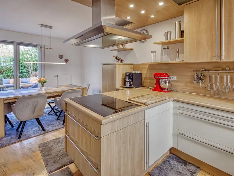 As soon as you enter the house, you are greeted by an inviting entrance area with ample space for a wardrobe and everyday utensils. The central hallway with adjoining guest WC leads directly into the open-plan living and dining area. Generous, floor-to-ceiling windows provide plenty of natural light and create a pleasant living atmosphere. The direct access to the newly laid terrace invites you to spend relaxing hours outdoors and enjoy convivial meals in the greenery.