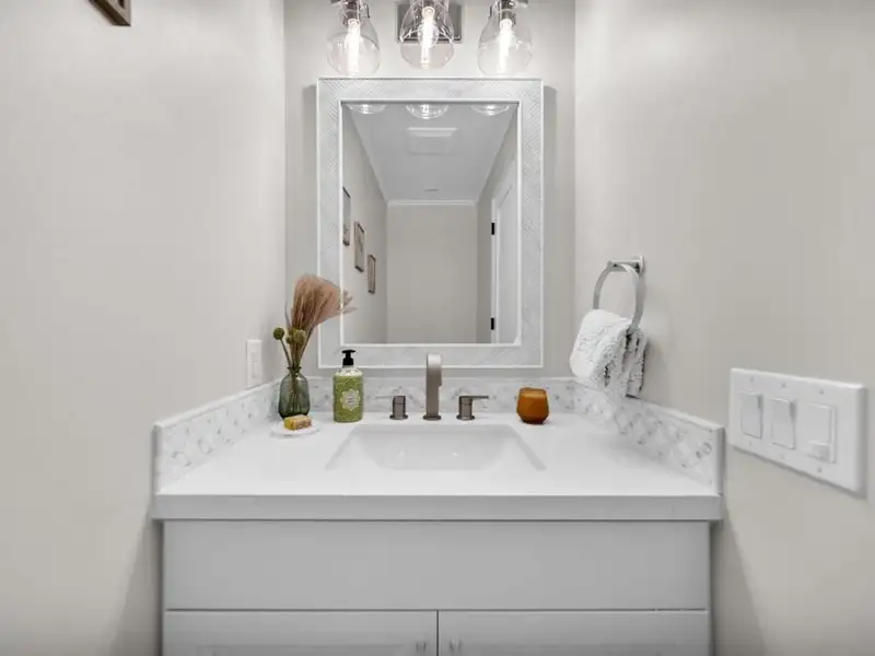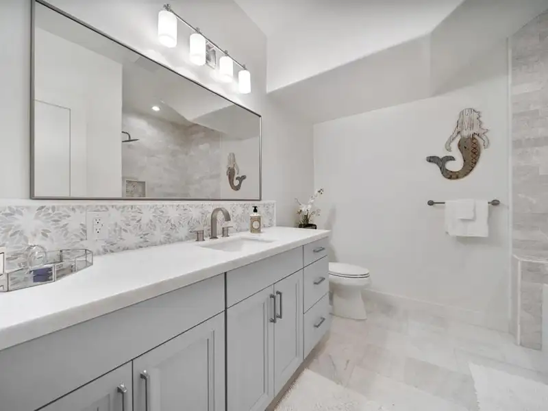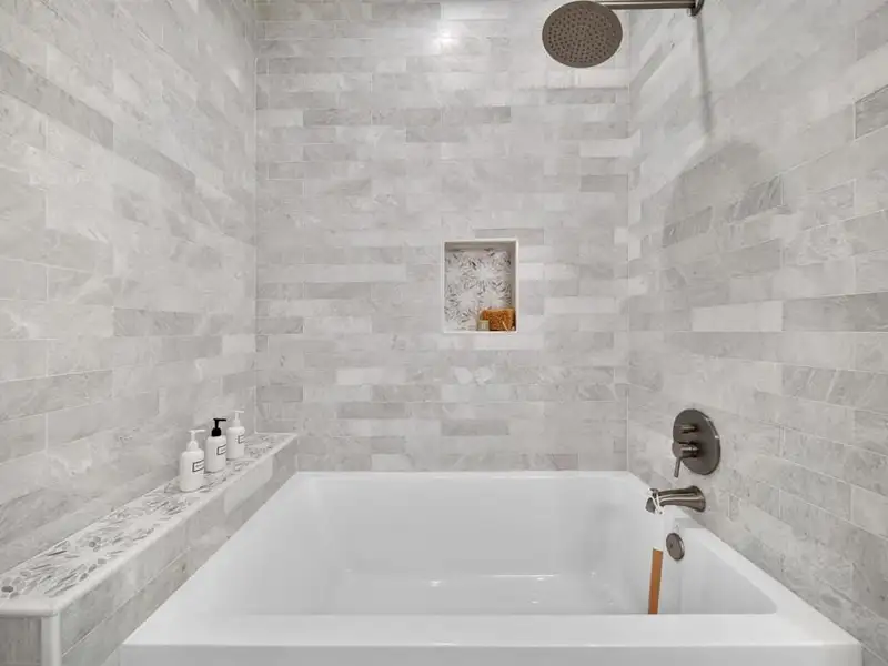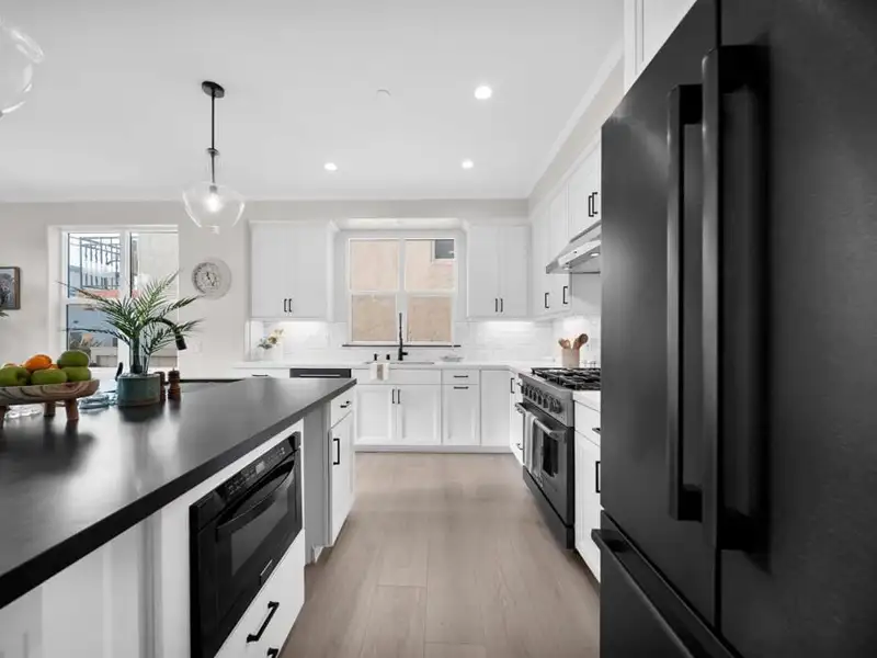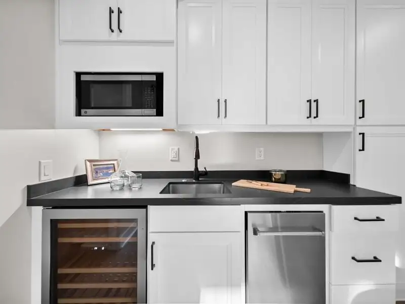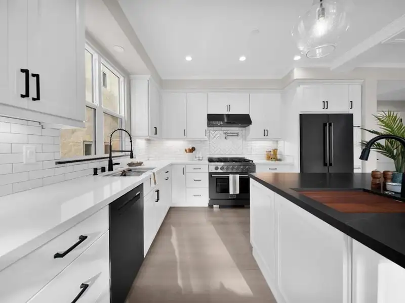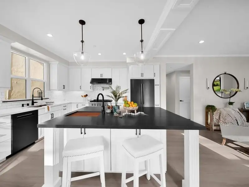 - Marble countertops and granite kitchen island