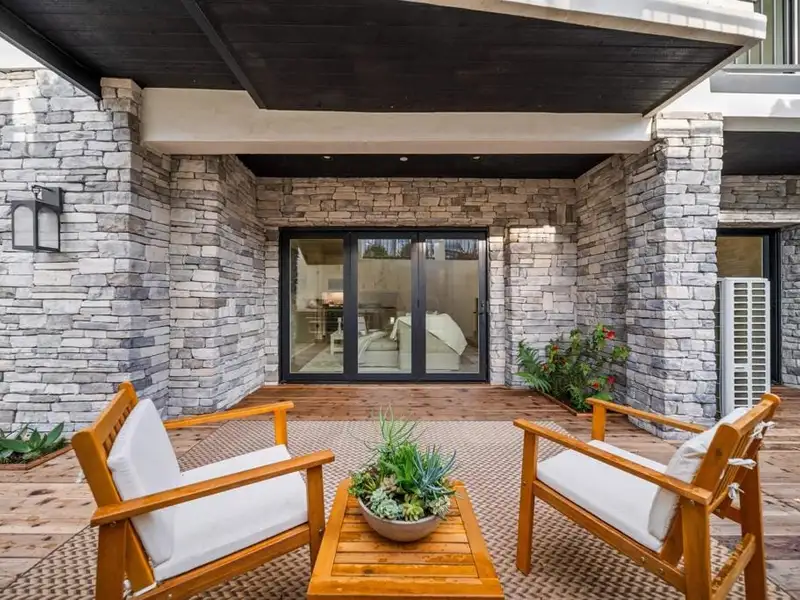- Outdoor courtyard with folding glass doors and firepit