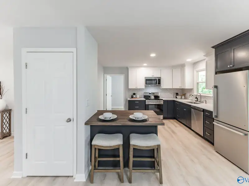 - Butcher block island in kitchen