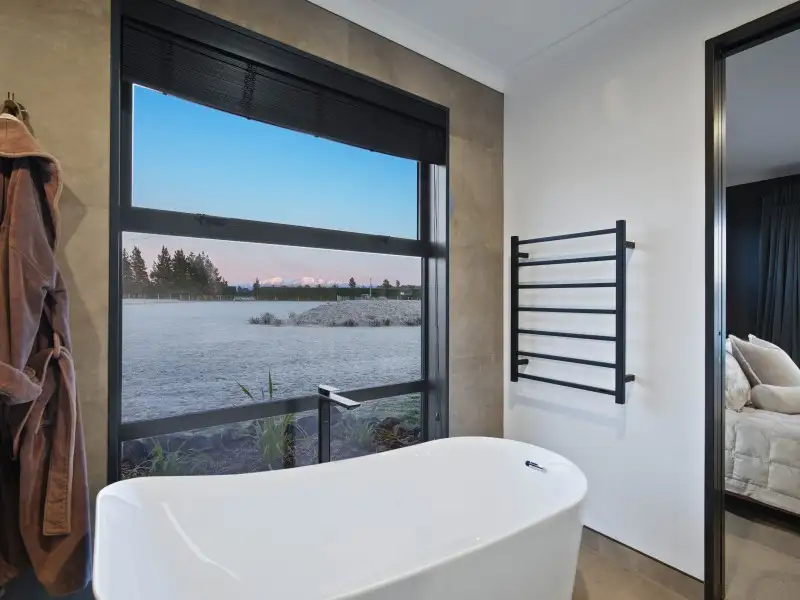 Three beautifully appointed bedrooms, each with breathtaking views. The master suite a true sanctuary, with outlook over deer–dotted paddocks to the majestic Southern Alps and foothills. The indulgent ensuite features a heated floor, dual showers with rain and monsoon heads, and a freestanding French tub, perfectly positioned for soaking in the alpine panorama. A walk–in wardrobe impresses with thoughtful design, extensive storage, hidden dressing table, full–length mirror, and solar tube lighting.