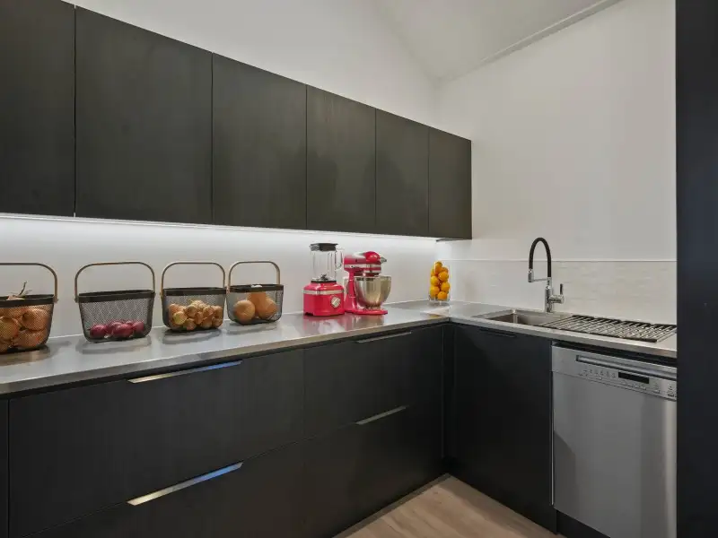 The home itself blends warmth with elegance. Heated by both a log fire and a zoned underfloor hydronic system throughout, it also benefits from air exchange and climate control. Stylish flooring runs through the living areas, complemented by high stud timber ceilings, solar tube skylights, and moody color palettes that create an ambience of refined calm.