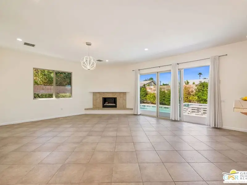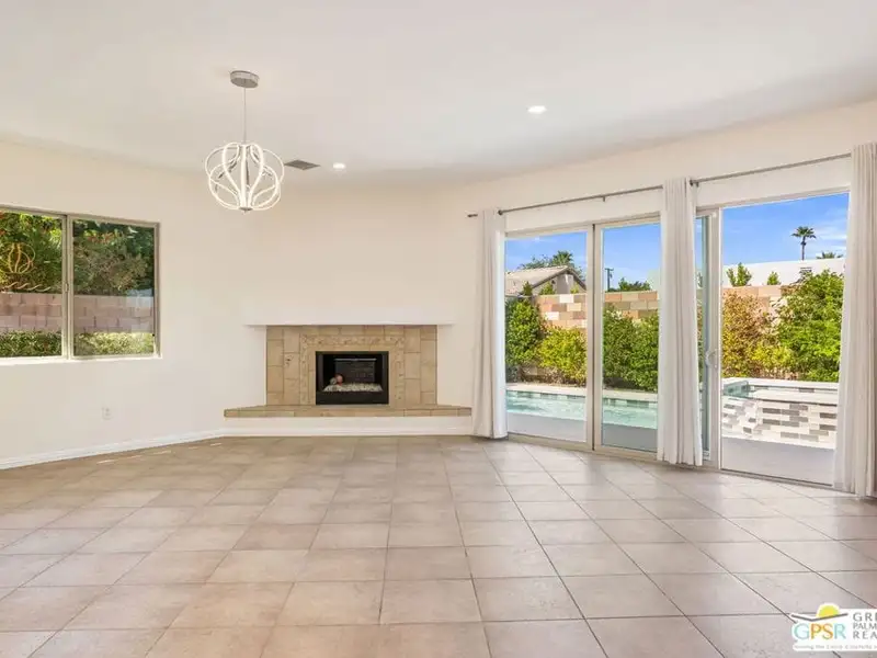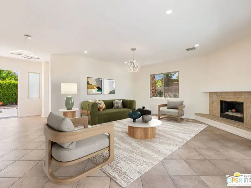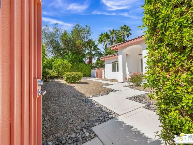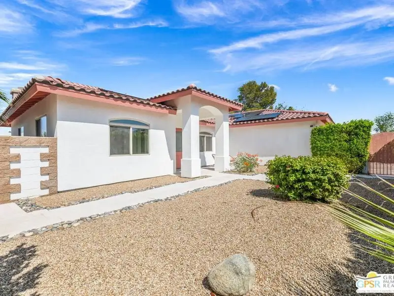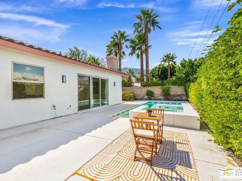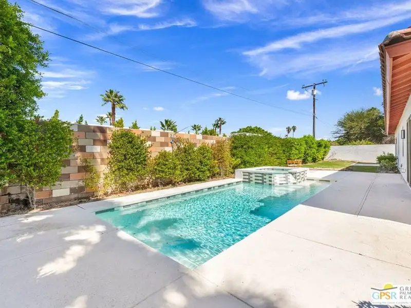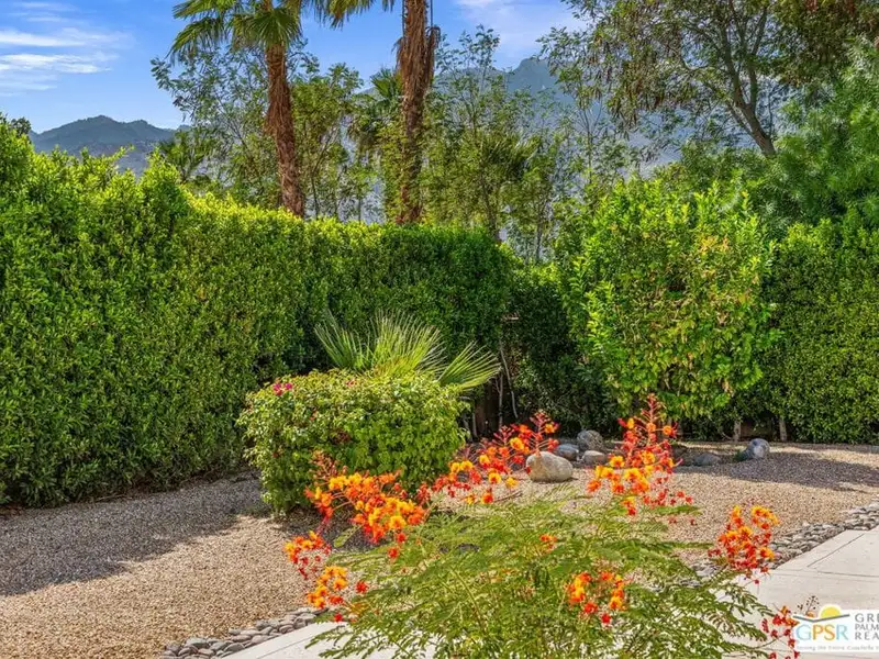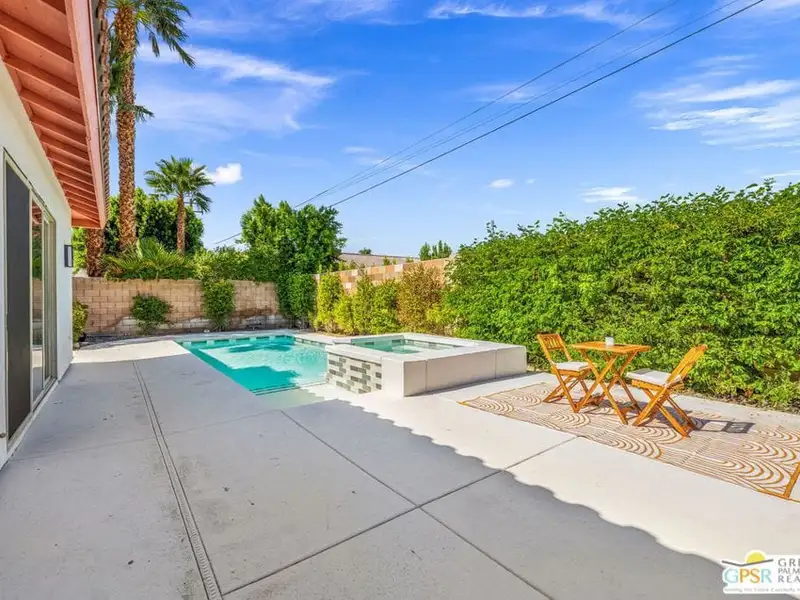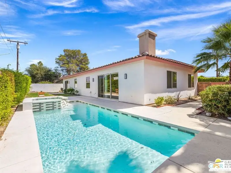Contemporary open-concept Palm Springs pool home showcasing rare 2003 construction in Desert Park Estates. This exceptionally light filled and private residence with 8-foot doors and soaring 10-foot ceilings throughout is a beautiful example of Palm Springs living: stylish, comfortable, and inviting.The property is fully walled for privacy, and once you step through the front gate, you're transported to your own private oasis. The large front courtyard and backyard pool and spa area with newly tiled surfaces, offer multiple spaces for lounging, relaxing, and entertaining, all complemented by a freshly painted exterior. Redesigned desert landscaping provides water efficiency while maintaining a sizable patch of grass for greenery and enjoyment. A tall privacy hedge at the front creates an additional courtyard living area that's ideal for outdoor entertaining.At the heart of the home, the expansive great room features a beautiful fireplace, soaring ceilings, and a triple panel of glass sliders that open to the pool and raised spa. The open-concept layout includes distinct, well-planned living, dining, and kitchen areas, with the kitchen offering tiled counters, a breakfast bar, and a large pantry.Inside, the home is light and bright, enhanced by fresh interior paint that highlights the open design and generous natural light throughout. The spacious primary suite features a beautifully appointed bathroom with dual sinks, a step-in tiled shower, a stand-alone soaking tub, and a walk-in closet with a large picture window framing views of the lush backyard. A second patio off the primary suite provides a private lawn area perfect for pets. The suite is joined by a guest bedroom, a third bedroom, and a newly constructed fourth bedroom ideal for an office or den.Additional highlights include 2.5 bathrooms, a separate laundry room, and an attached air-conditioned three-car garage with a split unit. Your energy costs are kept low with 14 owned and 34 leased solar panels at $203 per month. Thoughtfully oriented to capture mountain views, this home offers ideal spaces for both sun and shade. A truly happy and comfortable residence designed for serenity, privacy, and effortless Palm Springs living. Your desert oasis awaits!