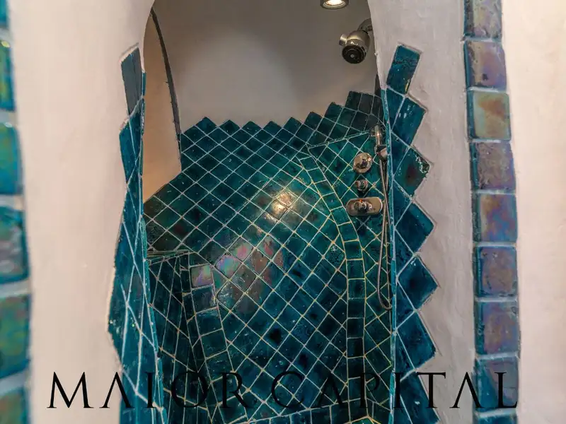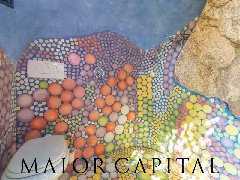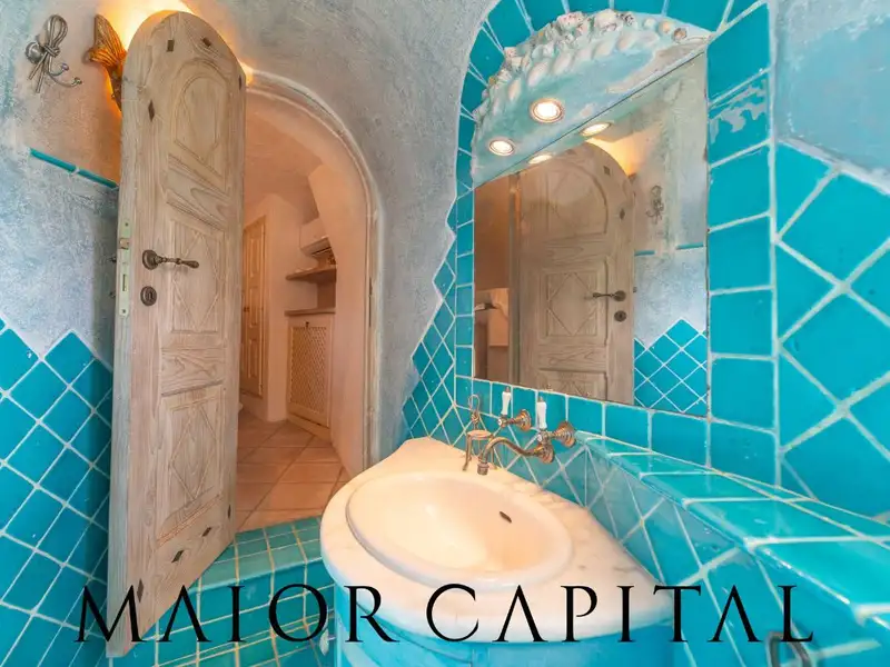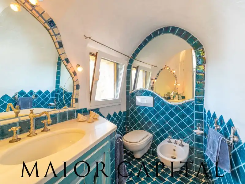The master suite, spacious and bright, opens onto nature with exclusive views and an en suite bathroom decorated with fine Cera Sarda tiles in shades of blue, light blue and brown, evoking the Mediterranean. The other double rooms, refined and quiet, maintain the same distinctive style and constant connection with the outdoors. Each space is designed to offer comfort, privacy and beauty.