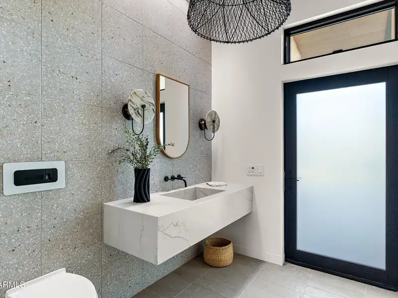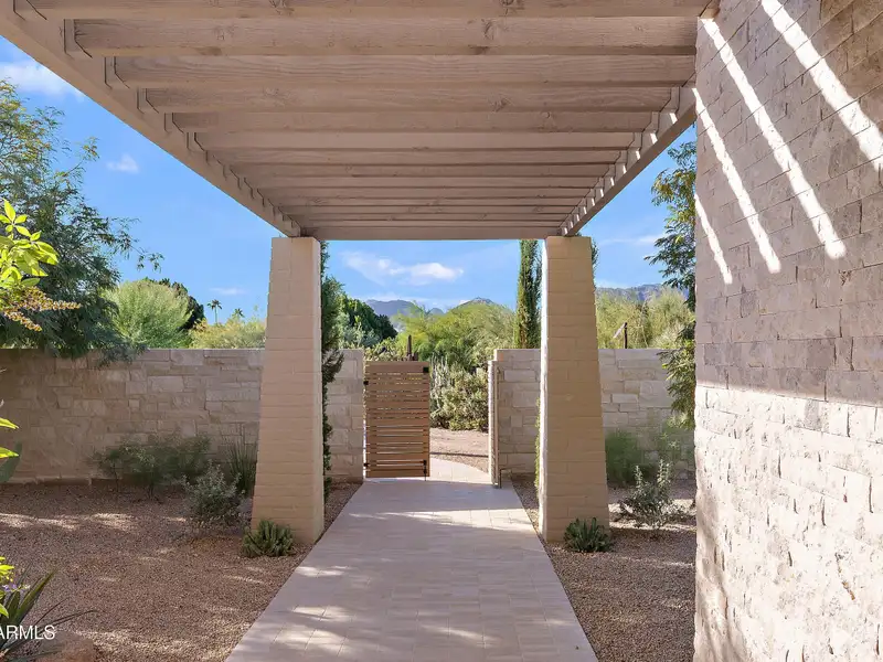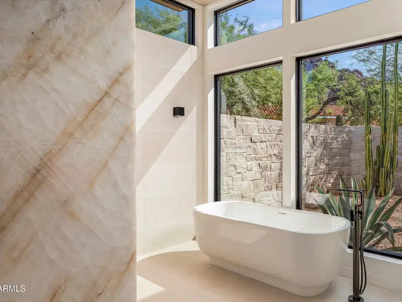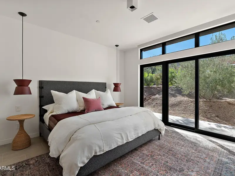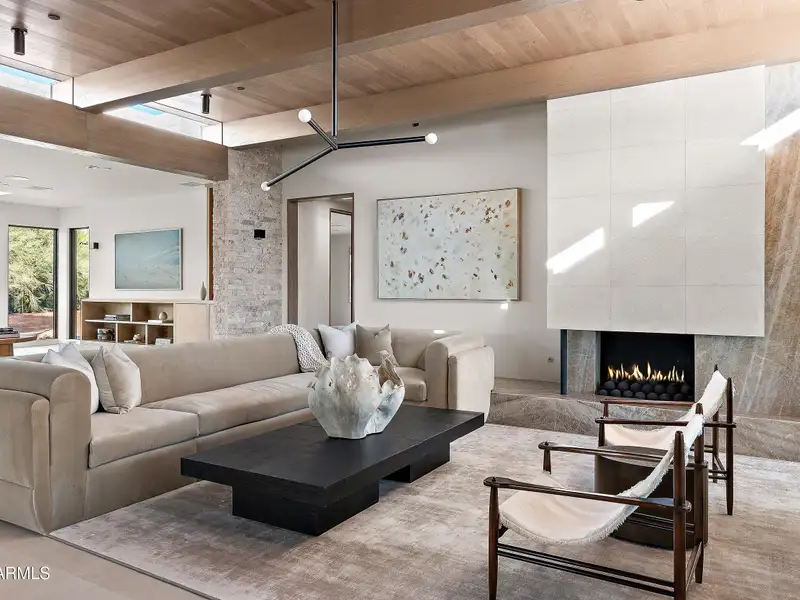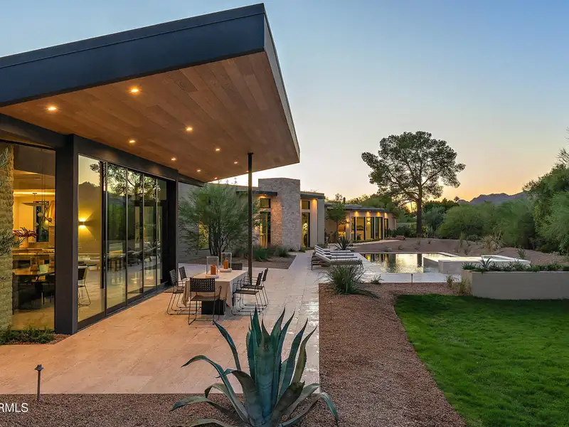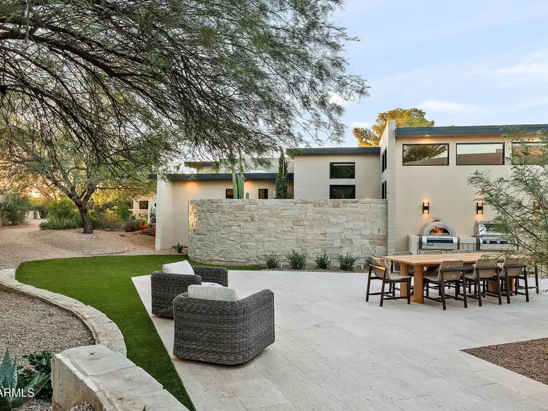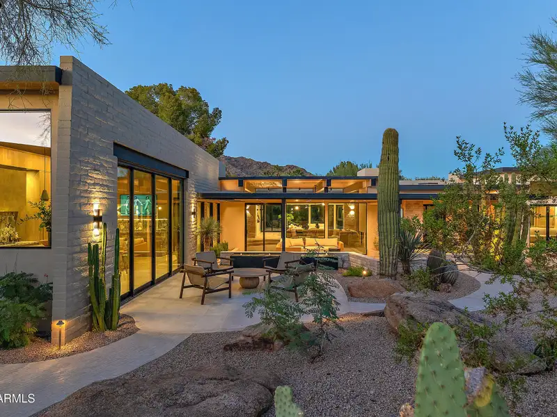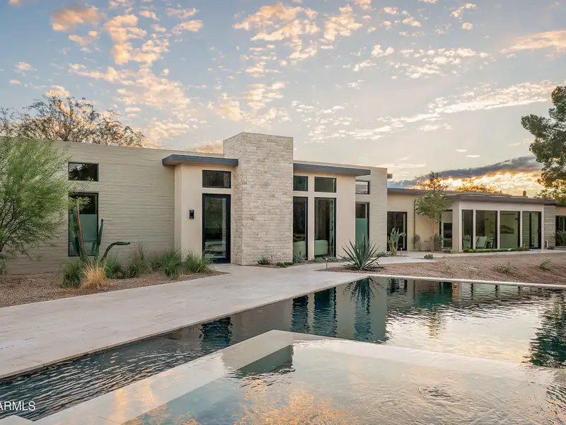 Just completed is a unique, sophisticated new-build by world renowned interior designer Erinn V, in collaboration with Erik Peterson/PHX Architecture. The estate represents a rare fusion of Arizona mid-century architecture, design heritage, & contemporary luxury in Paradise Valley's most desired location, with majestic views of Camelback, Mummy & Phoenix Mountain Preserve. The 1-acre estate includes 6985 sq ft of living space across the main & guest house with walls of glass capturing majestic mountain views & skylights flooding the interiors with natural light. Exceptional workmanship & top-quality materials include honed, oversized limestone flooring, bleached white oak ceilings, custom walnut millwork, Roman clay finishes, custom stonework & natural imported stone countertops. Enjoy the outdoors with lush landscaping, water fountains, and abundant seating areas that create a resort-like setting, while the 40' x 18' zero-edge pool and spa provide a centerpiece for leisure and entertaining.