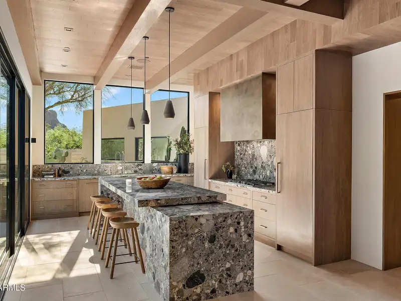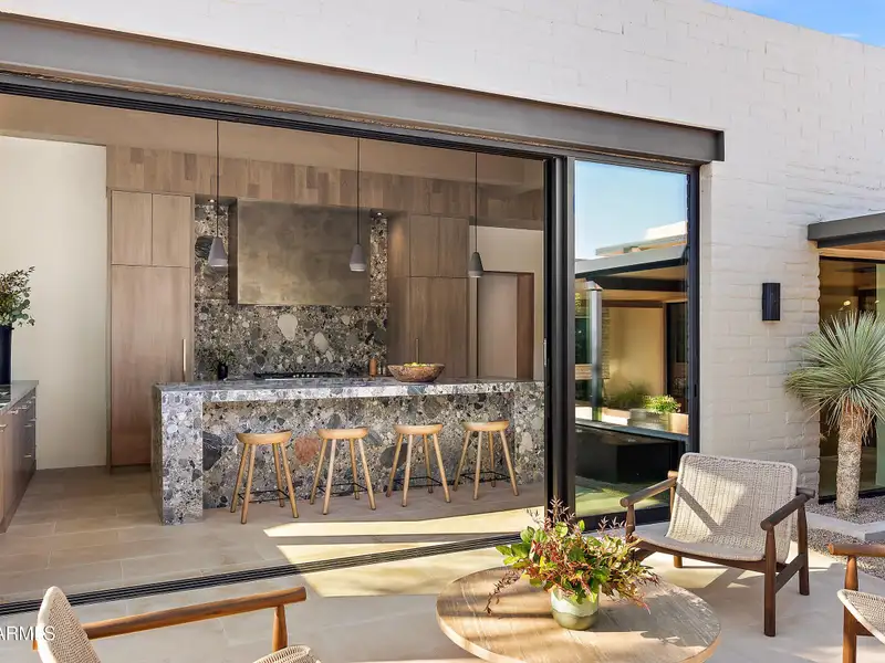 The main house features an impressive Chef's kitchen with walls of glass showcasing up-close views of iconic Camelback Mountain. Designed for both beauty and functionality, the kitchen is equipped with Monogram appliances, custom hand-finished walnut cabinets with white bronze pulls, butler's pantry and stone island clad in Ceppo Breccia slabs from Italy. Oversized sliding doors open the kitchen to a patio with fire features, a water feature and outdoor TV surrounded by beautiful lush desert landscaping.