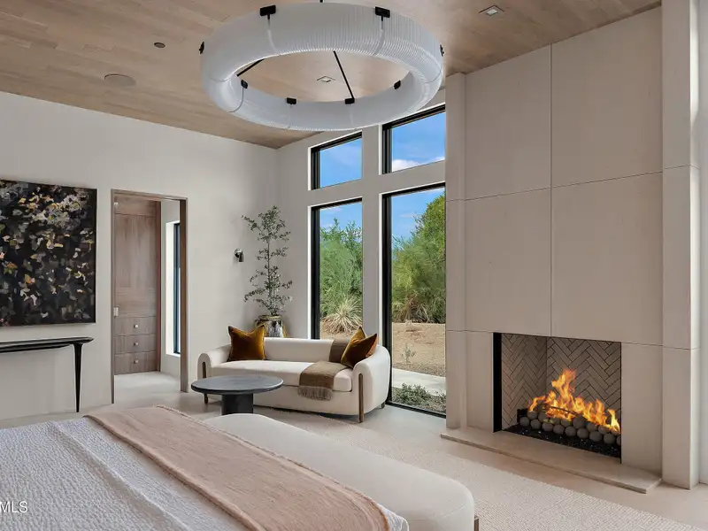 The owner's suite exudes a tranquil ambiance, highlighted by two private Zen gardens and a striking limestone fireplace. Blending elegance with functionality, it offers dual walk-in closets with custom Walnut floor to ceiling cabinetry and stone countertops, along with the convenience of a full-size washer and dryer.