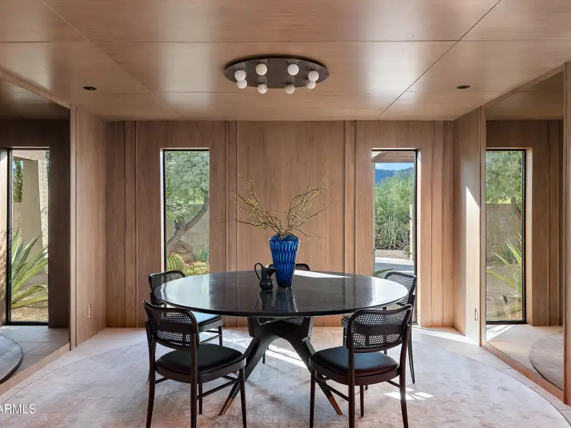 The private office makes a bold statement with bleached walnut millwork, built-in shelving, and expansive windows that frame breathtaking views of Camelback Mountain.