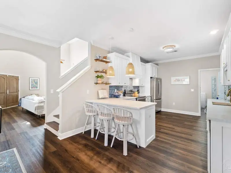 ASSUMABLE LOAN! Situated on a desirable corner lot, this breathtaking 4-bedroom, 3.5-bathroom coastal home is packed with luxurious updates! Step through the newly stained double wooden doors into a bright and airy living space, where soaring ceilings and brand-new wood-look flooring create a seamless and inviting atmosphere. The open layout flows effortlessly into the dining area and beautifully renovated kitchen, designed for both style and functionality. The kitchen is a true showpiece, featuring light quartz countertops, a breakfast bar, sleek stainless steel appliances, a stunning new backsplash, modern light fixtures, and stylish floating shelves for added charm and convenience. Located on the first floor, the spacious primary suite is a private retreat with double walk-in closets and oversized windows that fill the room with natural light. The newly remodeled ensuite bathroom is pure luxury, boasting a soaking tub, dual vanities, a beautifully tiled walk-in shower, and elegant new tile flooring. Additional highlights include a detached two-car garage, extra storage space, and a low-maintenance yard with a paved open patio-fantastic for relaxing or entertaining. Situated in a sought-after neighborhood just minutes from the beach, this home offers the ultimate coastal lifestyle. HOA amenities include a sparkling community pool, picnic area, and more. Don't miss this incredible opportunity-schedule your showing today and experience all this vibrant community has to offer!