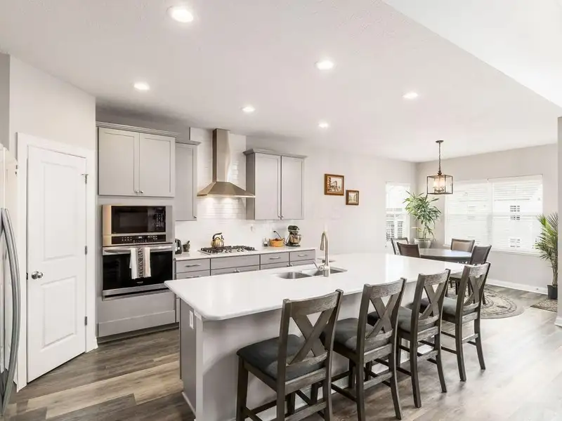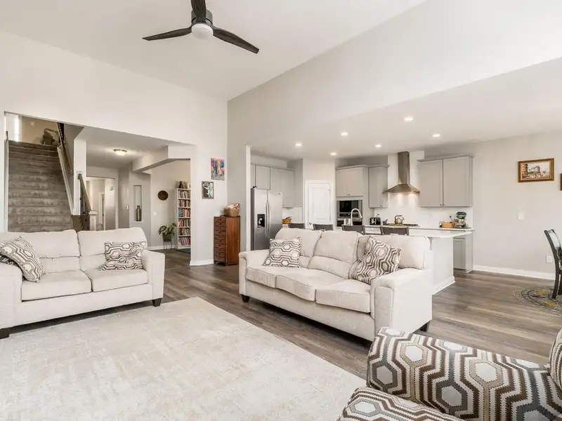 - Open floor plan with large kitchen island