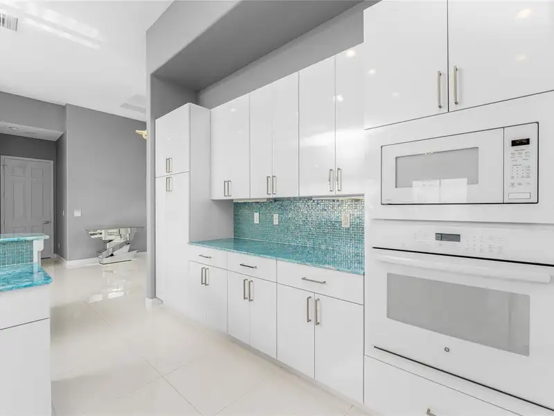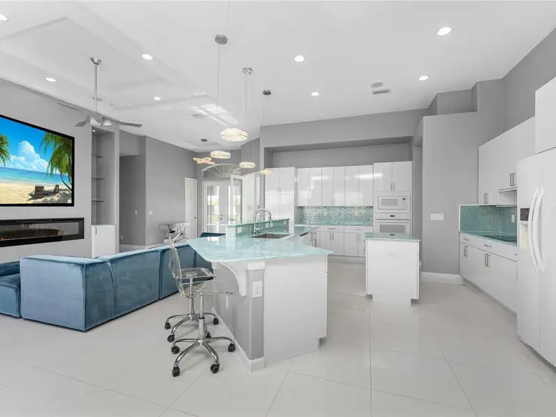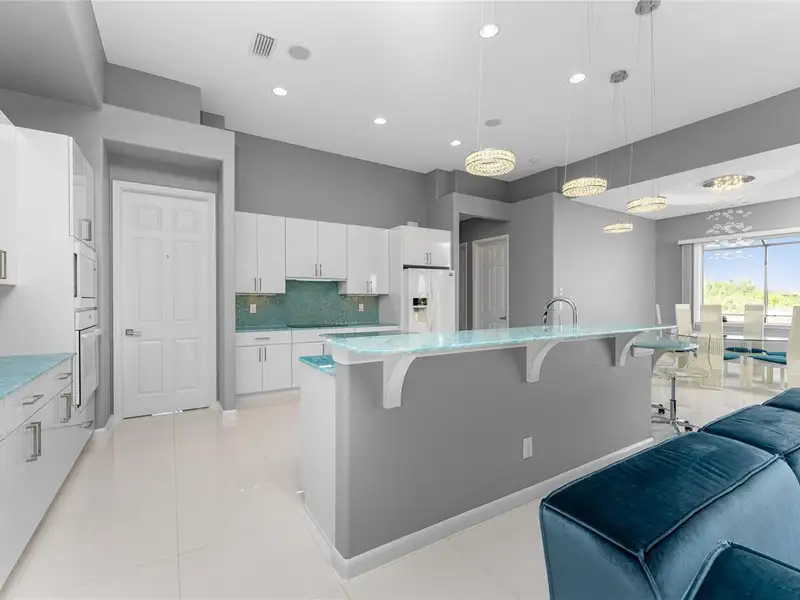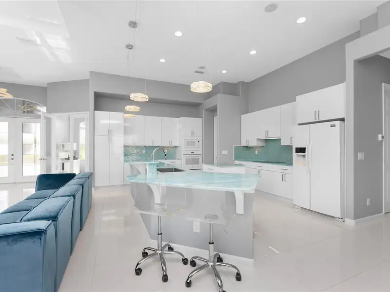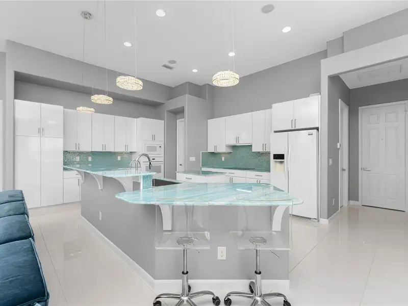 - Gourmet kitchen with aqua onyx countertops
