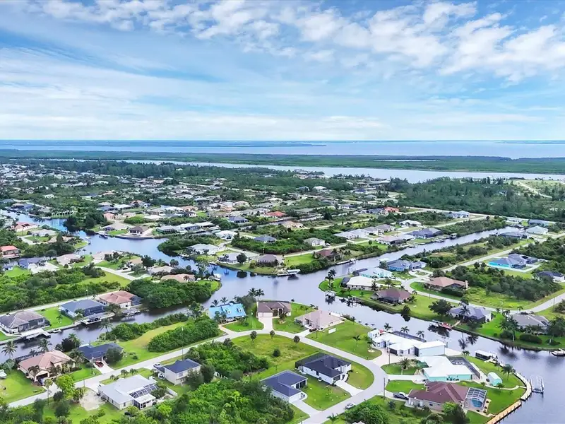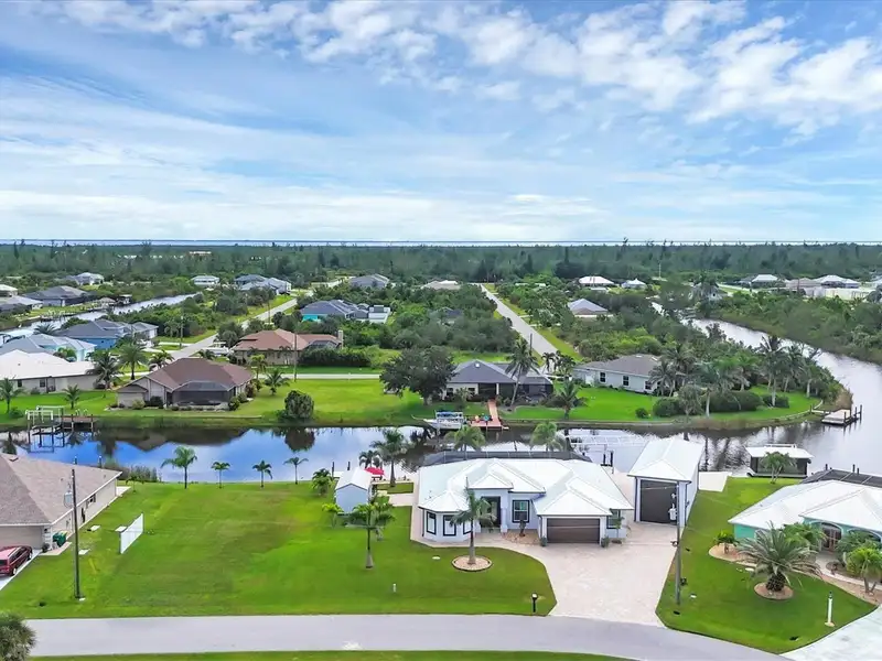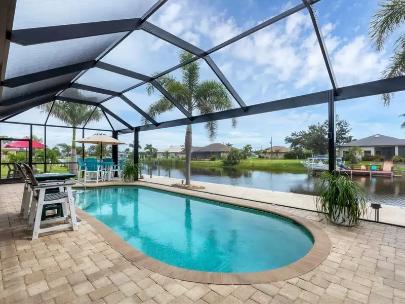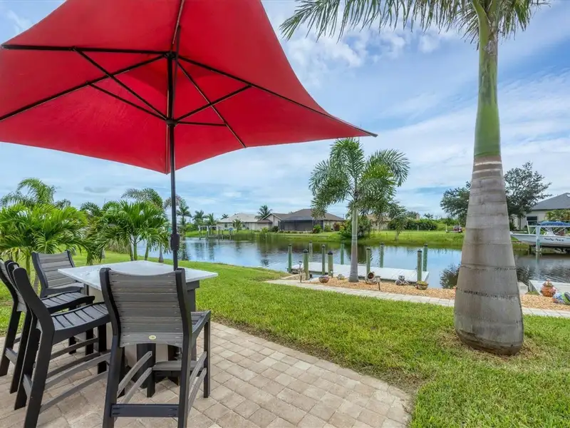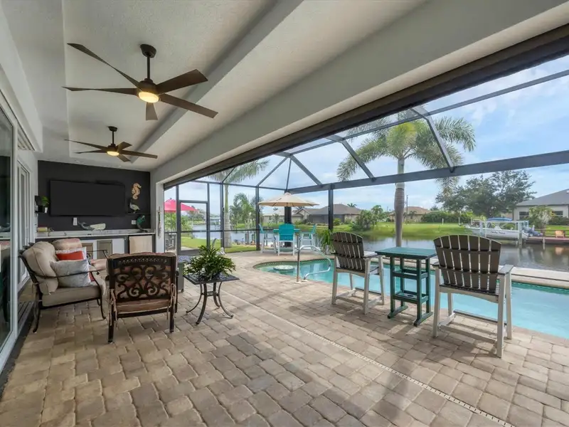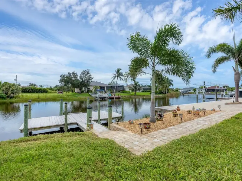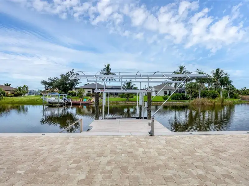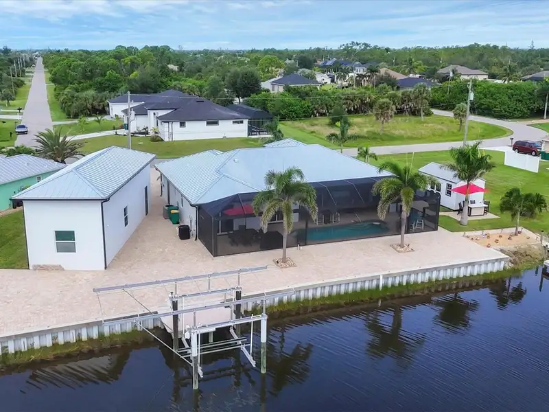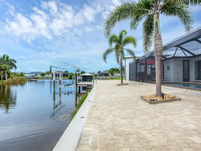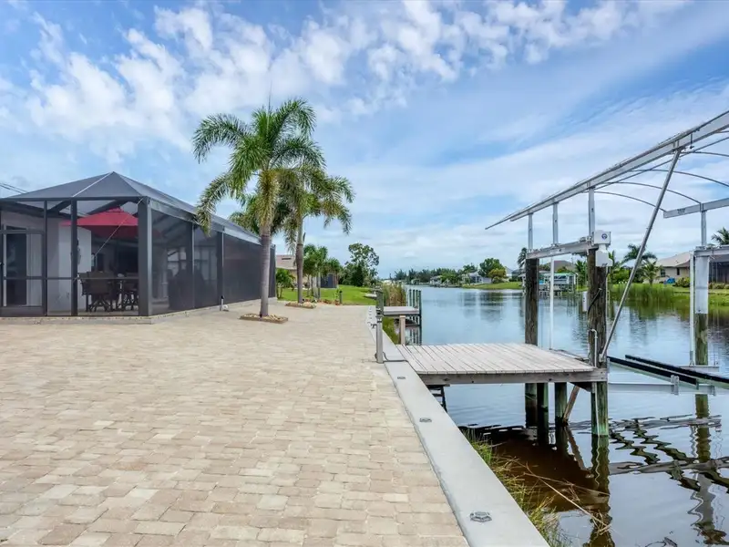 Welcome to coastal perfection in this exceptional custom-built waterfront home, nestled in the coveted South Gulf Cove community. This magnificent residence sits gracefully on a rare double lot, boasting an impressive 213 feet of waterfront, complete with two private docks, a 10,000 lb boat lift, and easy access to open water — your gateway to Boca Grande, Gulf beaches, and world-class fishing. Step into elegance through custom hurricane-rated double doors, where a grand open floor plan unfolds before you. Designed for both everyday living and sophisticated entertaining, this home is filled with natural light, highlighted by zero-degree corner sliders that completely disappear — seamlessly blending indoor and outdoor living. Imagine sunset cocktails on the expansive lanai, dips in the heated saltwater pool, and gatherings under the stars. The pavered driveway wraps gracefully around the home all the way to the docks, creating a stunning entrance and effortless functionality. For the culinary enthusiast, the gourmet kitchen is a dream: a center island, upscale stainless steel appliances, rich granite countertops, and cabinetry that’s as beautiful as it is functional. The great room features soaring 14-foot tray ceilings — adding to the drama and spaciousness of this thoughtfully designed floor plan. The master suite is your private retreat, with hurricane-rated sliders that open to the pool and water views. Indulge in a spa-like en suite bathroom with dual vanities and generous walk-in closets. Two additional guest bedrooms, positioned on the opposite wing of the home, offer peaceful privacy for family or visitors. Need space for the toys? You'll love the 15x48 RV garage, built to accommodate your biggest adventures — boats, campers, or collector vehicles — with plenty of room to spare. Top it all off with peace-of-mind upgrades: hurricane-impact windows and doors, reinforced garage doors, and a brand new roof (2025). Every detail of this home has been meticulously crafted for luxury, safety, and comfort. Paradise is calling. Schedule your private tour of this one-of-a-kind waterfront estate and experience what it feels like to live the Florida dream — in true million-dollar style.