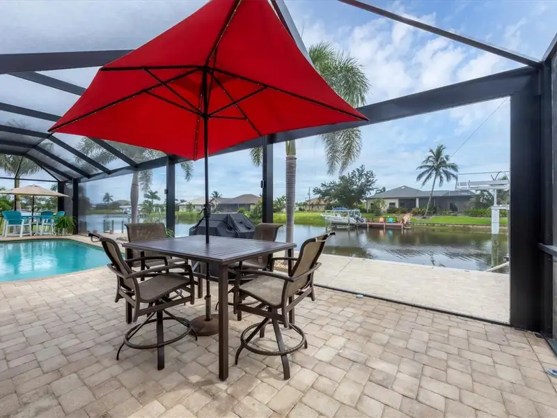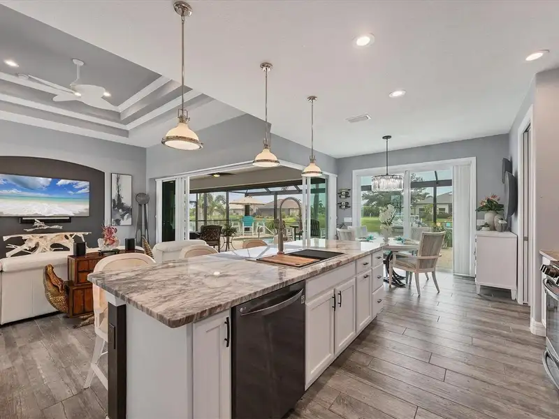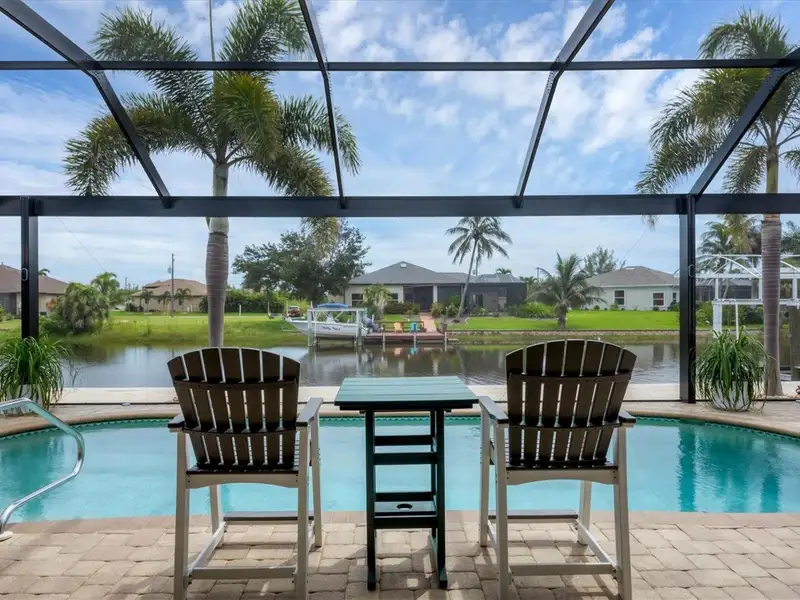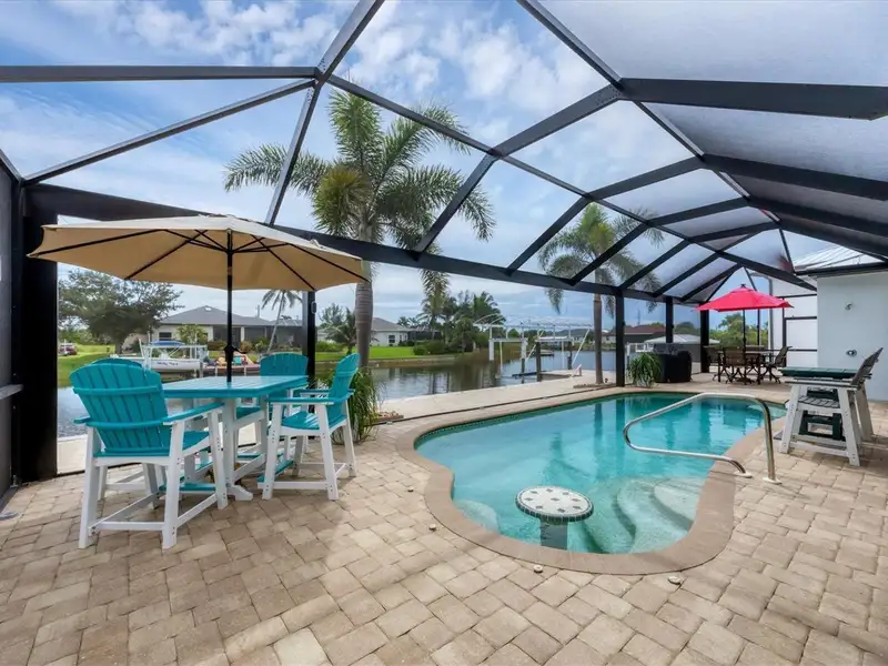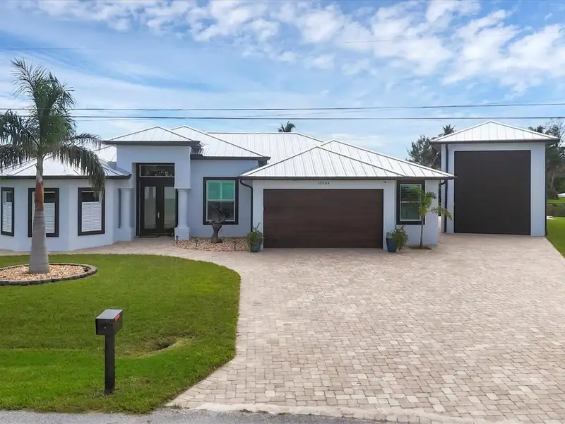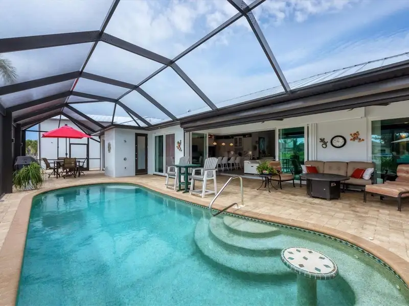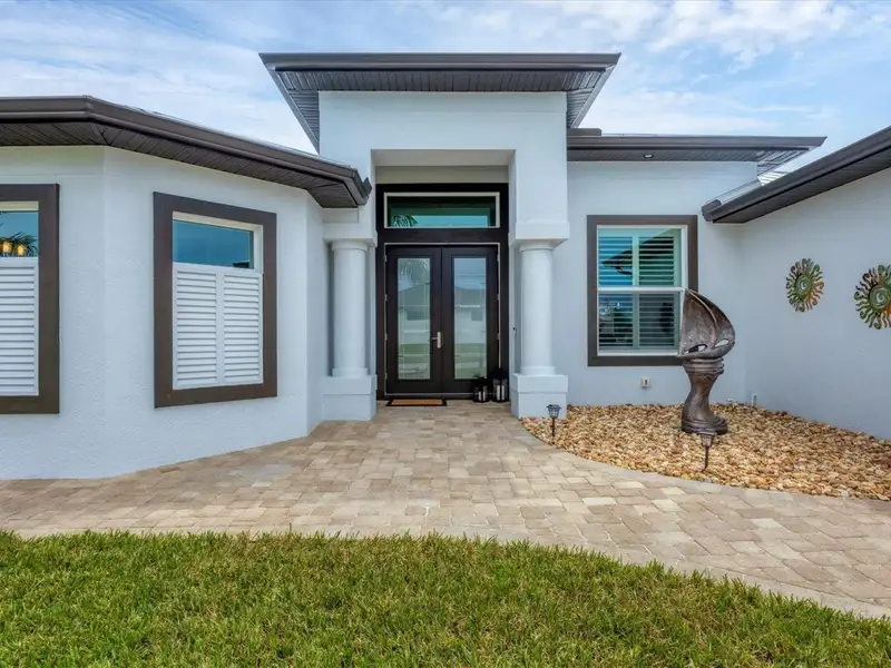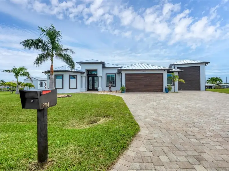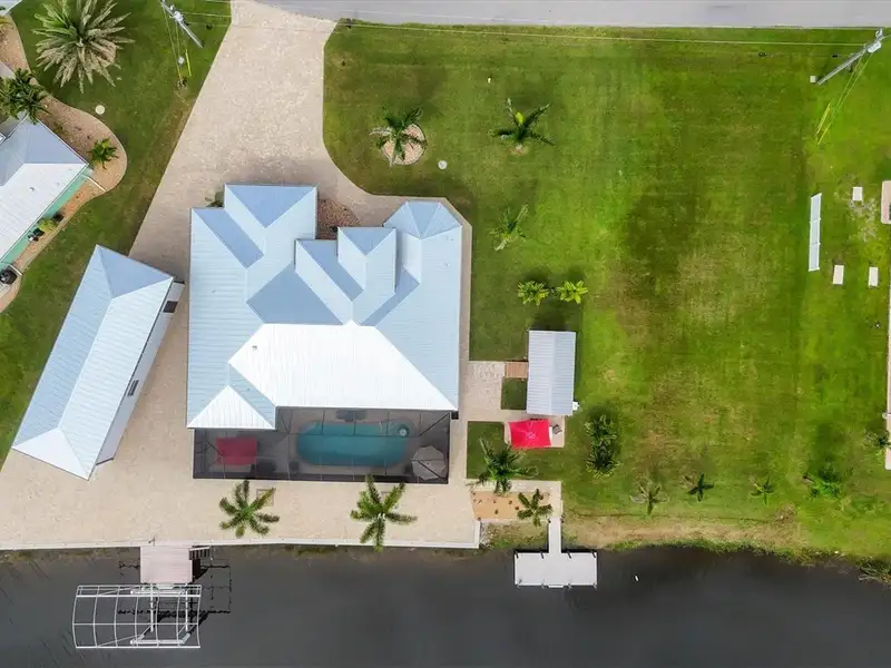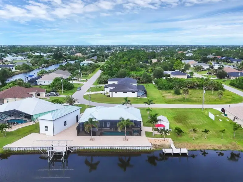 Welcome to coastal perfection in this exceptional custom-built waterfront home, nestled in the coveted South Gulf Cove community. This magnificent residence sits gracefully on a rare double lot, boasting an impressive 213 feet of waterfront, complete with two private docks, a 10,000 lb boat lift, and easy access to open water — your gateway to Boca Grande, Gulf beaches, and world-class fishing. Step into elegance through custom hurricane-rated double doors, where a grand open floor plan unfolds before you. Designed for both everyday living and sophisticated entertaining, this home is filled with natural light, highlighted by zero-degree corner sliders that completely disappear — seamlessly blending indoor and outdoor living. Imagine sunset cocktails on the expansive lanai, dips in the heated saltwater pool, and gatherings under the stars. The pavered driveway wraps gracefully around the home all the way to the docks, creating a stunning entrance and effortless functionality. For the culinary enthusiast, the gourmet kitchen is a dream: a center island, upscale stainless steel appliances, rich granite countertops, and cabinetry that’s as beautiful as it is functional. The great room features soaring 14-foot tray ceilings — adding to the drama and spaciousness of this thoughtfully designed floor plan. The master suite is your private retreat, with hurricane-rated sliders that open to the pool and water views. Indulge in a spa-like en suite bathroom with dual vanities and generous walk-in closets. Two additional guest bedrooms, positioned on the opposite wing of the home, offer peaceful privacy for family or visitors. Need space for the toys? You'll love the 15x48 RV garage, built to accommodate your biggest adventures — boats, campers, or collector vehicles — with plenty of room to spare. Top it all off with peace-of-mind upgrades: hurricane-impact windows and doors, reinforced garage doors, and a brand new roof (2025). Every detail of this home has been meticulously crafted for luxury, safety, and comfort. Paradise is calling. Schedule your private tour of this one-of-a-kind waterfront estate and experience what it feels like to live the Florida dream — in true million-dollar style.