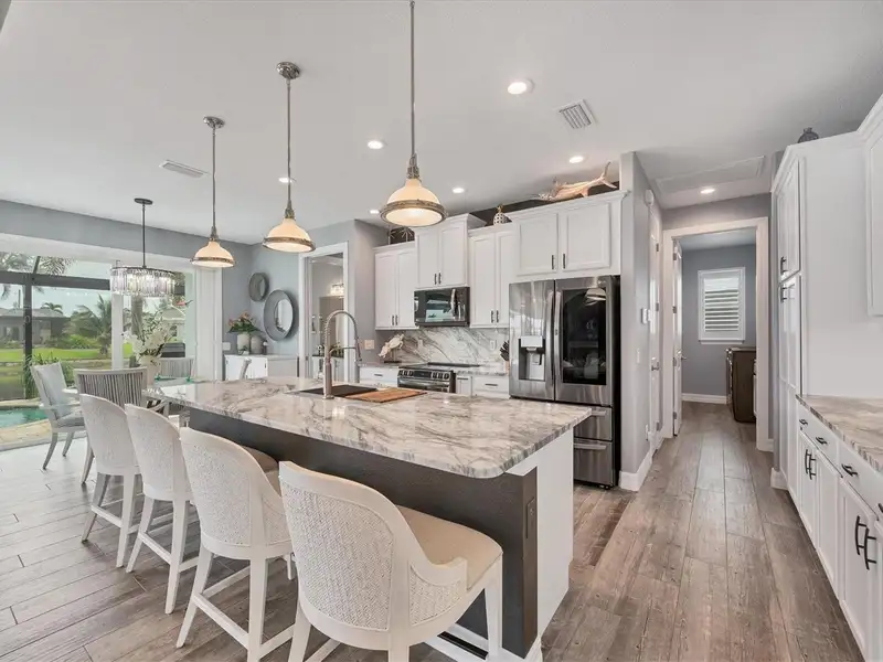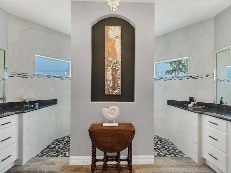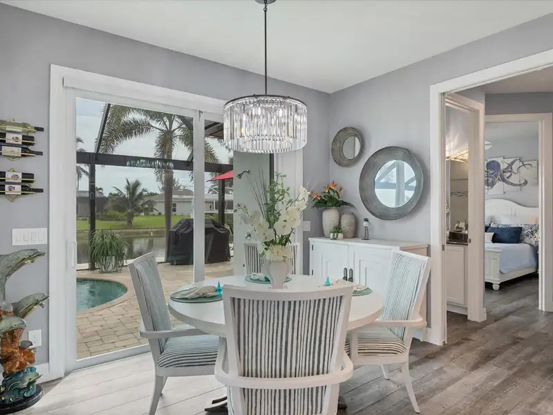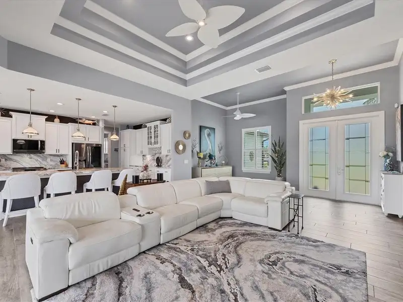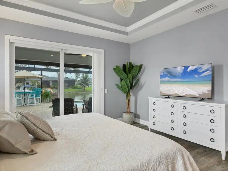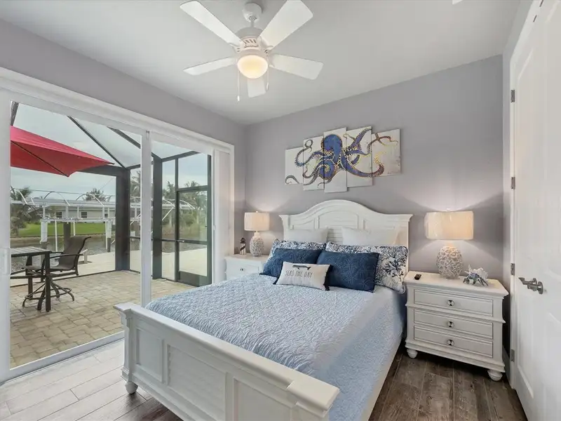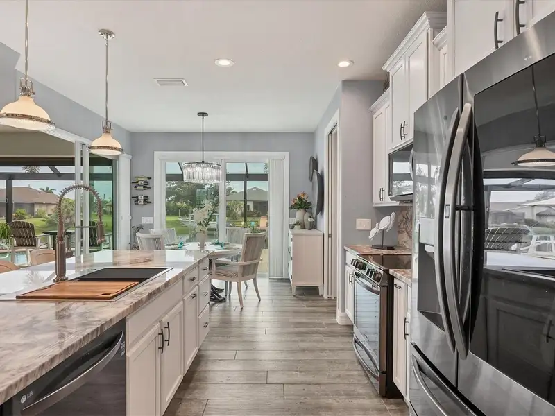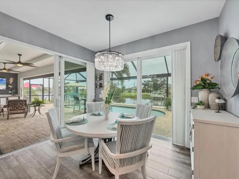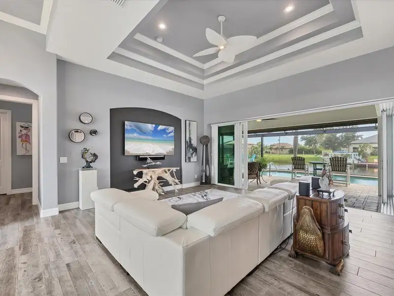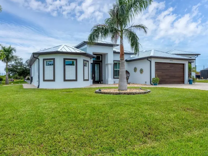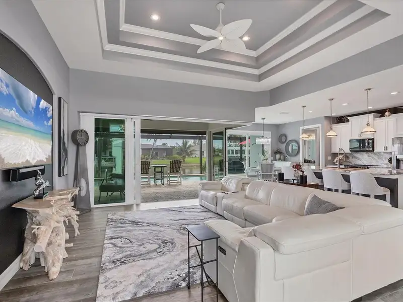 Welcome to coastal perfection in this exceptional custom-built waterfront home, nestled in the coveted South Gulf Cove community. This magnificent residence sits gracefully on a rare double lot, boasting an impressive 213 feet of waterfront, complete with two private docks, a 10,000 lb boat lift, and easy access to open water — your gateway to Boca Grande, Gulf beaches, and world-class fishing. Step into elegance through custom hurricane-rated double doors, where a grand open floor plan unfolds before you. Designed for both everyday living and sophisticated entertaining, this home is filled with natural light, highlighted by zero-degree corner sliders that completely disappear — seamlessly blending indoor and outdoor living. Imagine sunset cocktails on the expansive lanai, dips in the heated saltwater pool, and gatherings under the stars. The pavered driveway wraps gracefully around the home all the way to the docks, creating a stunning entrance and effortless functionality. For the culinary enthusiast, the gourmet kitchen is a dream: a center island, upscale stainless steel appliances, rich granite countertops, and cabinetry that’s as beautiful as it is functional. The great room features soaring 14-foot tray ceilings — adding to the drama and spaciousness of this thoughtfully designed floor plan. The master suite is your private retreat, with hurricane-rated sliders that open to the pool and water views. Indulge in a spa-like en suite bathroom with dual vanities and generous walk-in closets. Two additional guest bedrooms, positioned on the opposite wing of the home, offer peaceful privacy for family or visitors. Need space for the toys? You'll love the 15x48 RV garage, built to accommodate your biggest adventures — boats, campers, or collector vehicles — with plenty of room to spare. Top it all off with peace-of-mind upgrades: hurricane-impact windows and doors, reinforced garage doors, and a brand new roof (2025). Every detail of this home has been meticulously crafted for luxury, safety, and comfort. Paradise is calling. Schedule your private tour of this one-of-a-kind waterfront estate and experience what it feels like to live the Florida dream — in true million-dollar style.